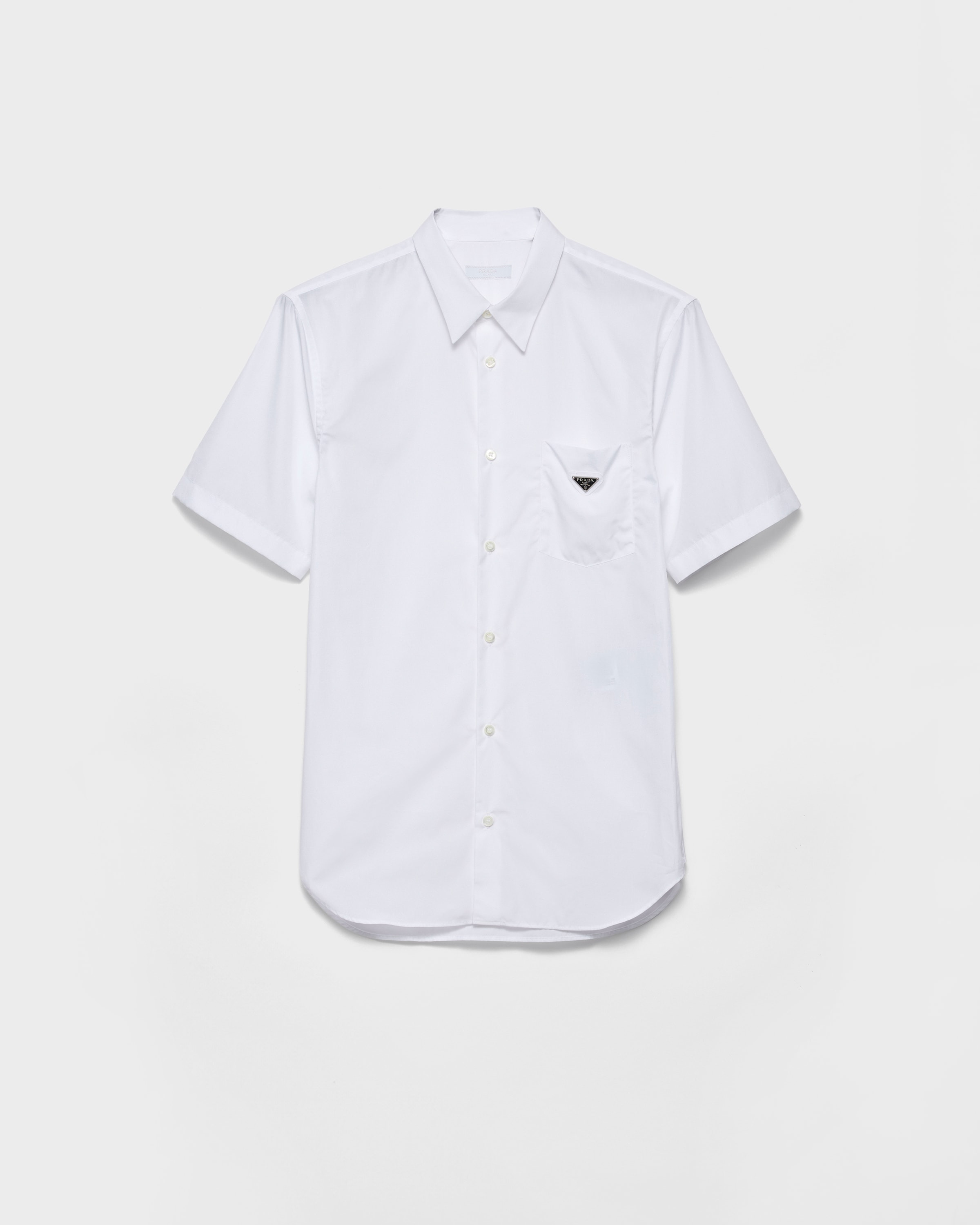 The short-sleeved cotton shirt, a staple of the Prada wardrobe, is presented in its simple form with a straight cut and slim fit. The triangle logo completes the minimalist design with an iconic note. - Product code: UCS526_10IV_F0009_S_OOO - Slim fit - Classic collar - Small patch pocket - Rounded hem - Mother-of-pearl button closure - Enameled metal triangle logo - Imported - The model is 190 cm tall and wears a size 48 Height: 76cm MATERIALS Main material: 100% cotton