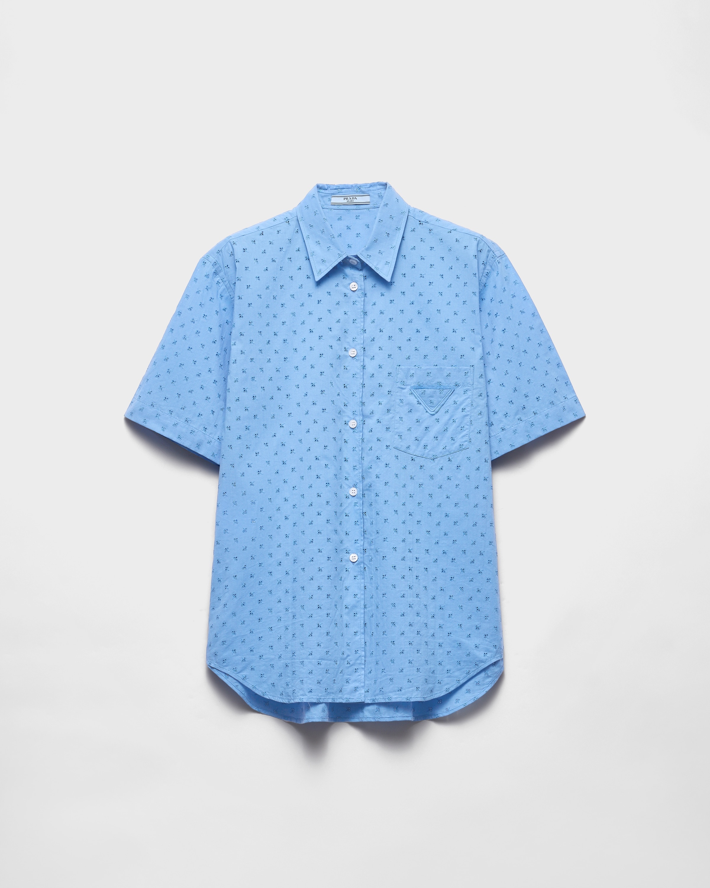The silhouette of this shirt with a menswear fit is embellished by the romantic and delicate allure of eyelet lace, presented with micro embroidery that creates a refined motif. The simple geometric shape of the emblematic triangle logo adds its signature touch to the design. - Product code: P455I_17FK_F0013_S_OOO - Menswear fit - Unlined - Classic collar - Front button closure - Short sleeves - Patch pocket - Conceptual fabric triangle logo - Rounded hem - Imported - The model is 181 cm tall and wears a size 38 Height: 75cm MATERIALS Main material: 100% cotton
