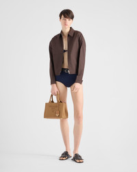 With its refined and modern design, this canvas handbag combines style and practicality. The compact design features a shoulder strap for versatile wear, while the embroidered front logo and leather details add a touch of sophistication. - Product code: 1BG464_2CYA_F04MO_V_8OM - Canvas handles - Adjustable and detachable logo-print shoulder strap. Maximum length 105 cm - Minimum length 66 cm - Maximum drop 54 cm - Minimum drop 35 cm - Metal hardware - Embroidered front logo and enameled metal triangle logo on the key ring - Snap closure on the sides - Canvas lining with two pockets, one with zipper - With purse feet - Imported Height: 19cm Width: 26cm Length: 15cm MATERIALS Main material: Cotton