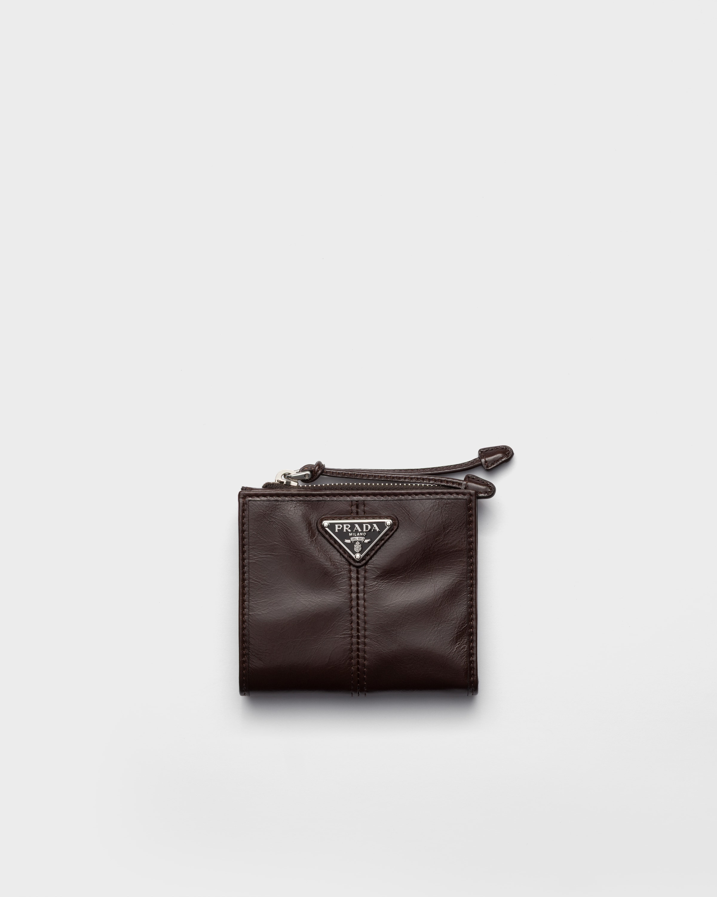 This wallet with a compact yet functional design is made of shiny leather that gives the accessory a modern, refined look. - Product code: 2ML049_2CX7_F0003 - Snap closure - Enameled metal triangle logo - Four card slots - One bill compartment - Two internal pockets - External zipper coin pocket - Moire and leather lining - Imported Height: 9cm Width: 10cm MATERIALS Main material: Calfskin