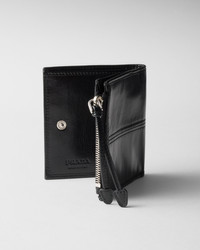 This wallet with a compact yet functional design is made of shiny leather that gives the accessory a modern, refined look. - Product code: 2ML049_2CX7_F0002 - Snap closure - Enameled metal triangle logo - Four card slots - One bill compartment - Two internal pockets - External zipper coin pocket - Moire and leather lining - Imported Height: 9cm Width: 10cm MATERIALS Main material: Calfskin