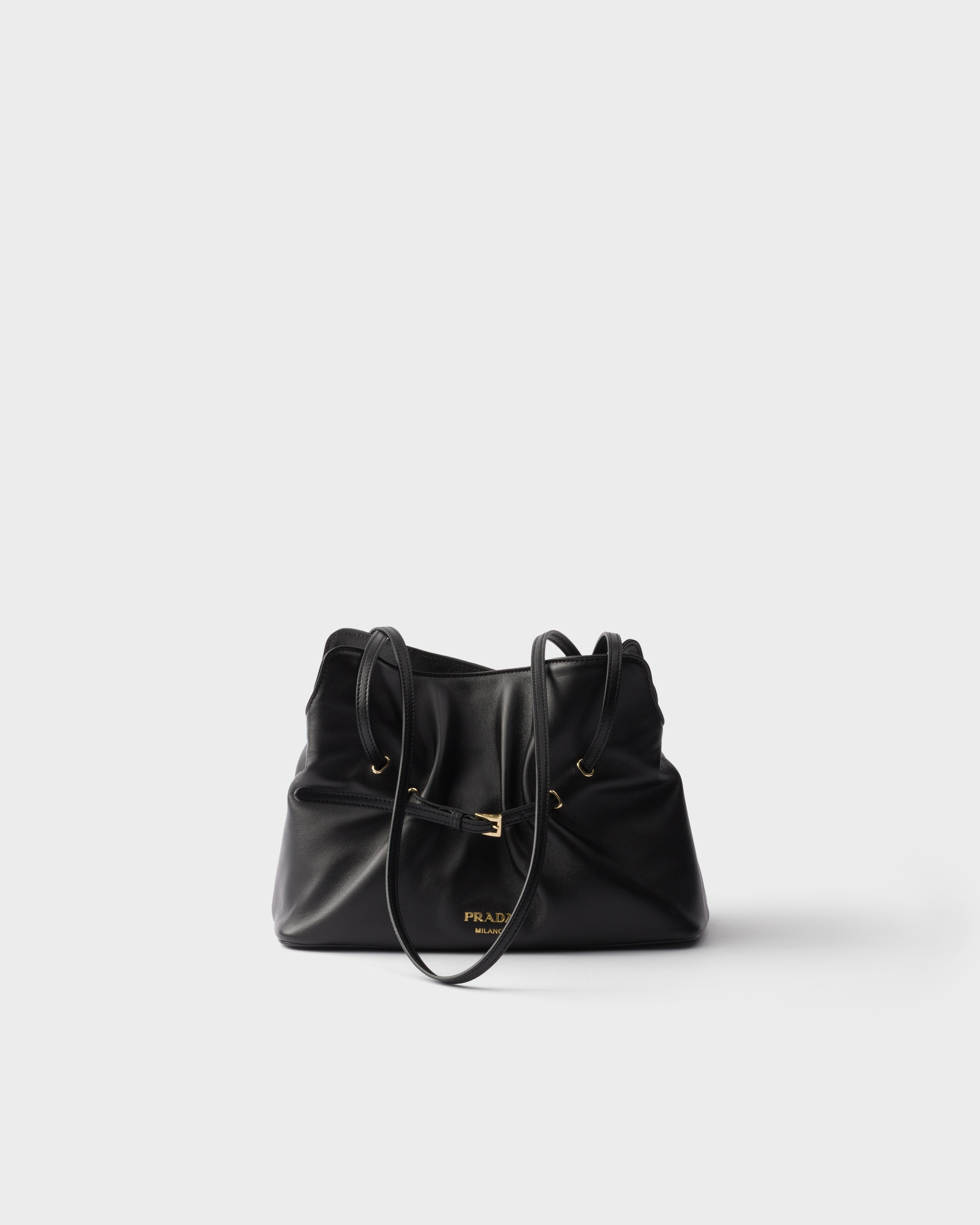 The Dada bag embodies natural and authentic elegance balancing form and function. A narrow belt shapes the volume of the nappa leather accessory, creating soft folds and tucks. The light, feminine construction is completed by long handles that suggest a practical and refined gesture. - Product code: 1BG586_2DX8_F0002_V_OOO - Nappa leather handle, drop 32 cm - Metal hardware - Embossed lettering logo on the front - Magnetic closure - Nappa leather lining with center pocket - Imported Height: 18.5cm Width: 25cm Length: 11.5cm MATERIALS Main material: Lambskin