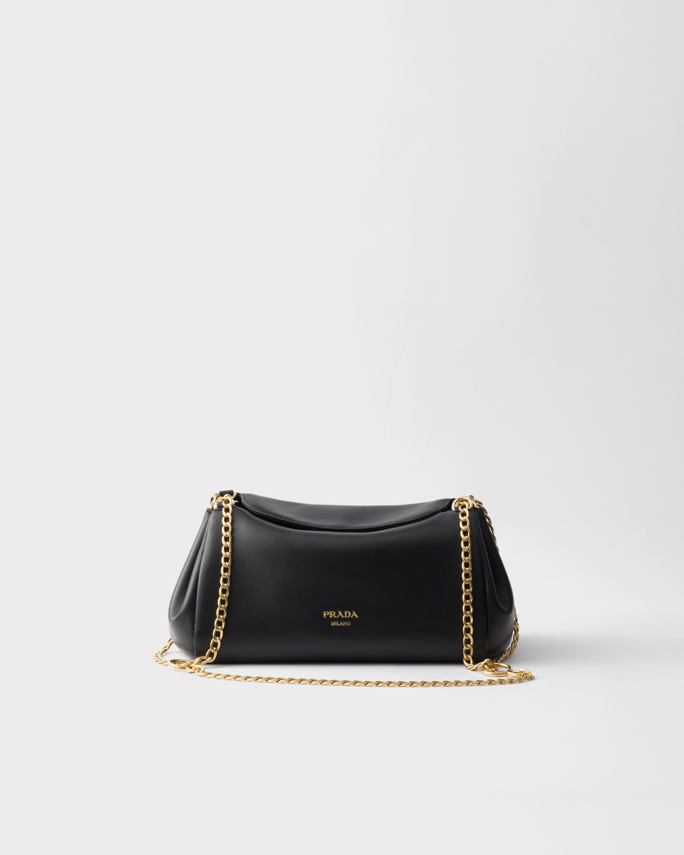 The Tumulte bag suggests a dynamic and sophisticated gesture, an expression of authentic, personal style. The nappa leather design is characterized by soft side pleats and curved lines that form a refined, feminine silhouette. The bag is embellished with three sliding chain handles that can be combined to wear the accessory in different ways. - Product code: 1BD395_2DX8_F0002_V_COO - Chain handles - Detachable chain shoulder strap, length 40, drop 40 cm - Metal hardware - Embossed lettering logo on the front - Magnetic closure on the flap - Nappa leather lining with zipper pocket - Imported Height: 13cm Width: 24cm Length: 13cm MATERIALS Main material: Lambskin