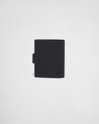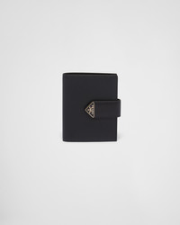This small wallet with sleek elegance comes in a combination of smooth and Saffiano leather, an iconic Prada material with a crosshatch texture. Characterized by its minimal design and equipped with several compartments and pockets, the accessory is accented with the iconic enameled triangle logo of the brand embellishing the closure. - Product code: 1MV204_2DYG_F0002 - Snap closure - Enameled metal triangle logo - One bill compartment - Three card slots - Two internal pockets - Internal coin compartment with flap - Moire and leather lining - Imported Height: 11.2cm Width: 8.5cm MATERIALS Main material: Calfskin