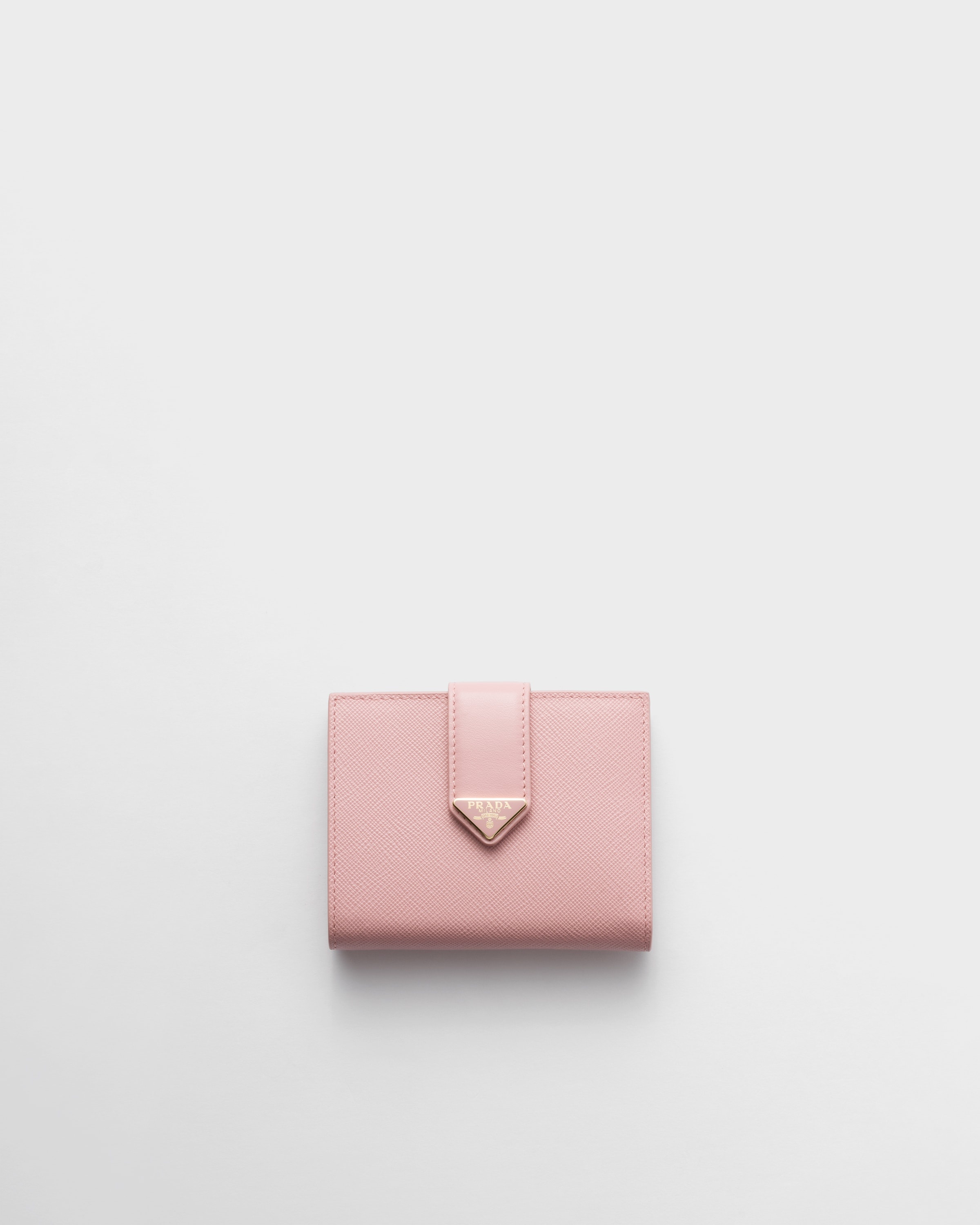 This small wallet with sleek elegance comes in a combination of smooth and Saffiano leather, an iconic Prada material with a crosshatch texture. Characterized by its minimal design and equipped with several compartments and pockets, the accessory is accented with the iconic enameled triangle logo of the brand embellishing the closure. - Product code: 1MV204_2DYG_F0924 - Snap closure - Enameled metal triangle logo - One bill compartment - Three card slots - Two internal pockets - Internal coin compartment with flap - Moire and leather lining - Imported Height: 11.2cm Width: 8.5cm MATERIALS Main material: Calfskin