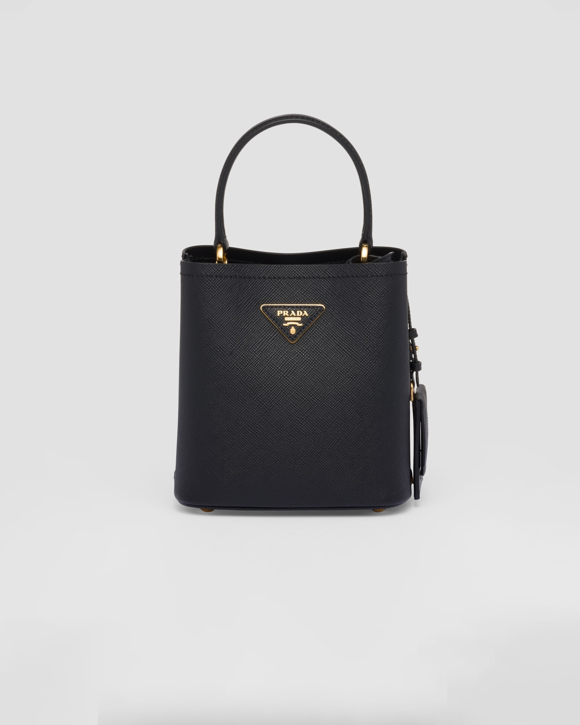 The iconic texture of Saffiano leather characterizes the compact Prada Panier bag. The elegant design of the bag with single handle is distinguished for the strap closure on the top. - Product code: 1BA217_2ERX_F0002_V_OOO - Leather handle - Detachable and adjustable 105 cm leather shoulder strap - Removable leather name tag - Metal hardware - Metal lettering logo on a leather triangle at the front - Magnet closure - Nappa leather lining with center pocket - Small feet on the bottom - Imported Height: 18cm Width: 17cm Length: 10.5cm MATERIALS Main material: Calfskin
