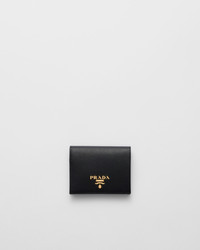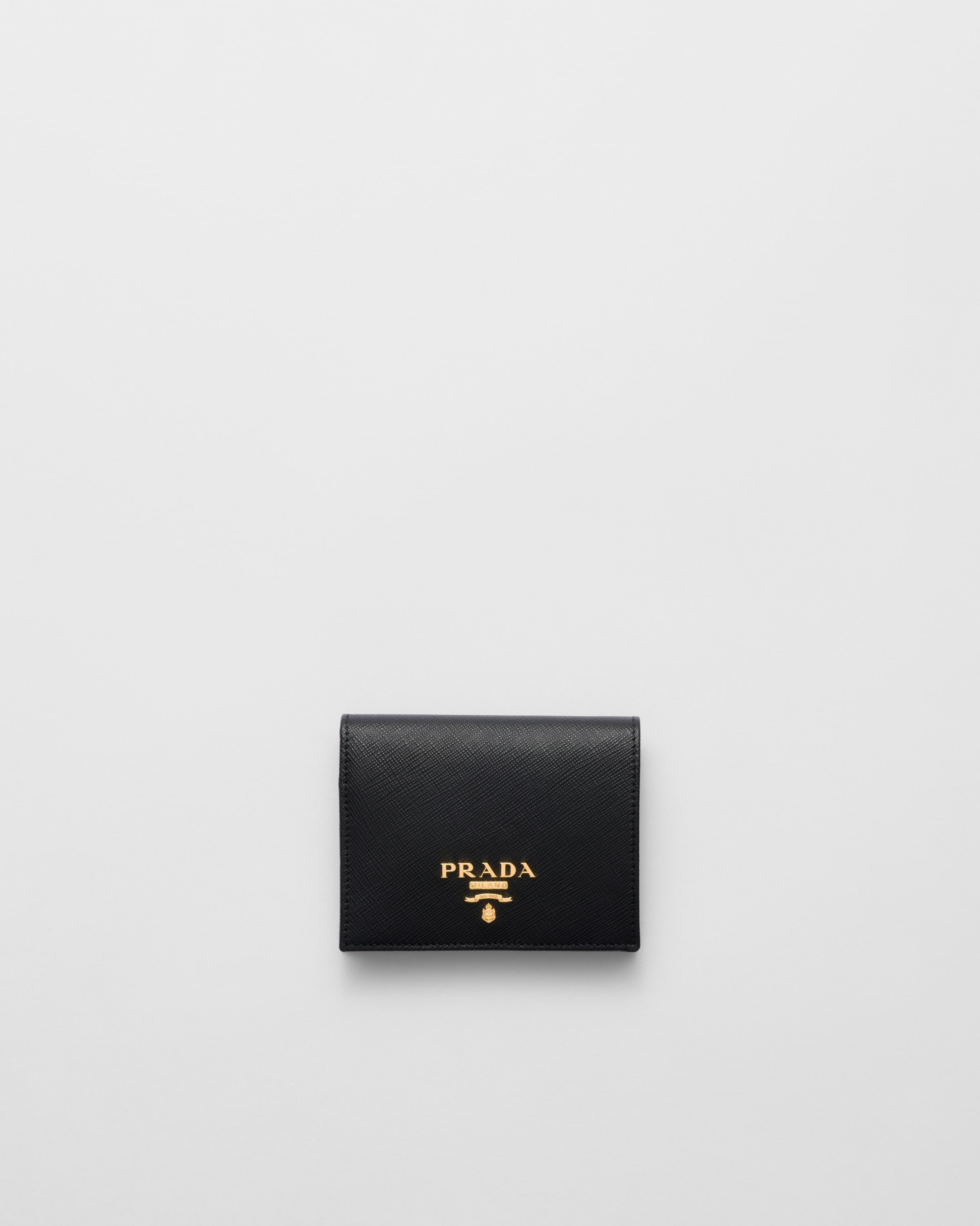A Saffiano leather bi-fold wallet embellished with gold-toned Prada lettering. The snap closure reveals card slots, a bill compartment and coin compartment, all decorated with a colorful design. - Product code: 1MV204_ZLP_F061H - Multicolored Saffiano leather lining - Snap fastener - Metal lettering logo - One bill compartment - Three card slots - Two internal pockets - Internal coin pocket with flap - Moire and Saffiano leather lining - Imported Height: 11.2cm Width: 8.5cm MATERIALS Main material: Calfskin