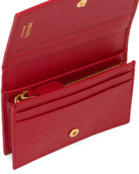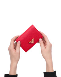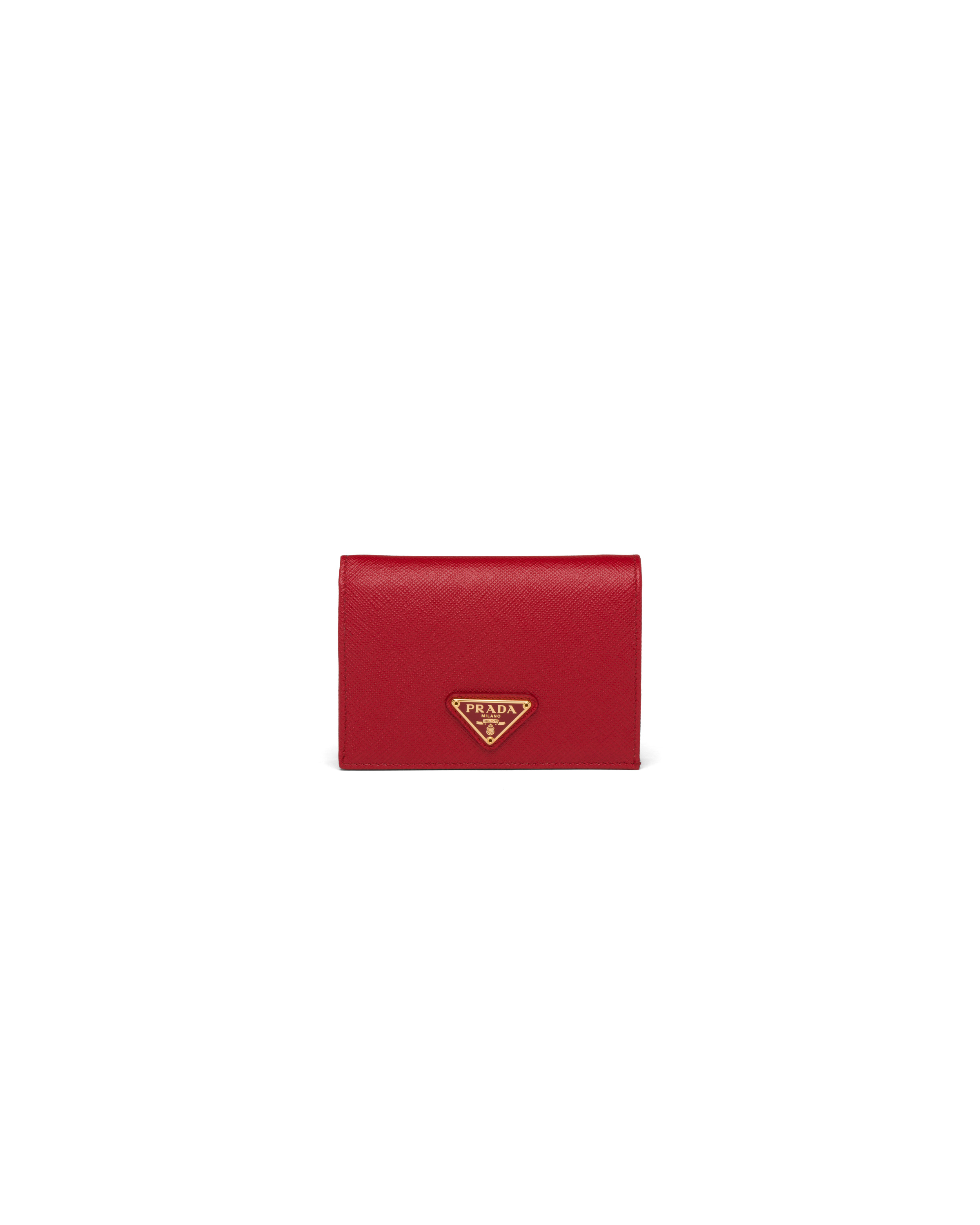 This Saffiano leather wallet with enameled metal triangle logo expresses sleek elegance. The accessory with clean lines has a zipper coin compartment, bill compartment, and four card slots. - Product code: 1MV021_QHH_F068Z - Snap fastener - Enameled metal triangle logo - One bill compartment - Four card slots - Two internal pockets - Internal coin pocket with zipper - Moire and Saffiano leather lining - Imported Height: 11.2cm Width: 8.5cm MATERIALS Main material: Calfskin