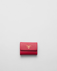 This Saffiano leather wallet with the metal logo on the front flap has a compact, modern design. - Product code: 1MH025_QWA_F068Z - Snap fastener - Metal lettering logo - One bill compartment - Six card slots - Two internal pockets - Internal coin pocket with zipper - Moire and Saffiano leather lining - Imported Height: 9.5cm Width: 12cm MATERIALS Main material: Calfskin