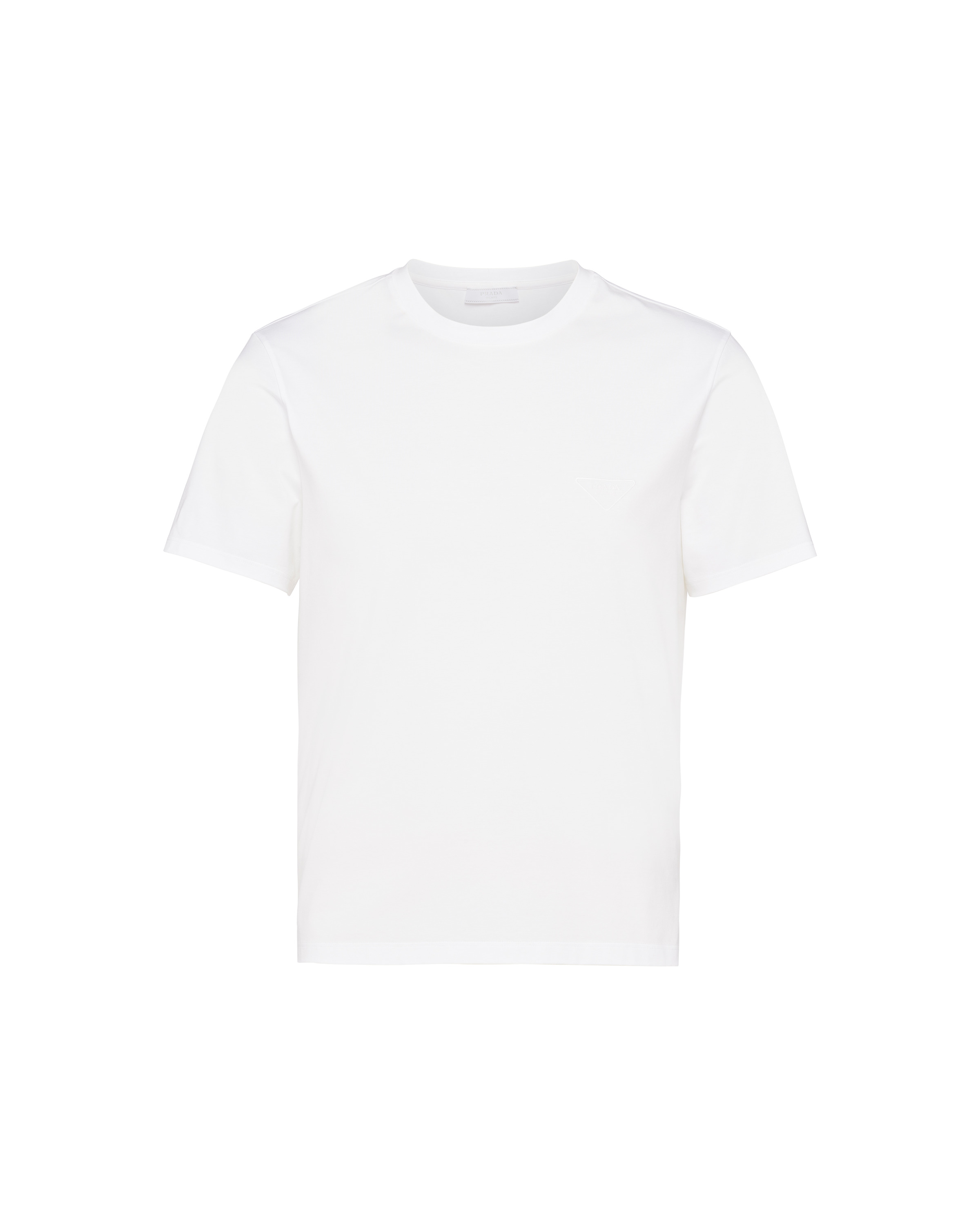The Prada T-shirt, an essential garment of the brand, embodies the luxury of simplicity that becomes an attitude and search to reinvent the basics and propose new meanings. This version in cotton is defined by its slim fit that emphasizes the silhouette. - Product code: UJN712_1YDP_F0009_S_211 - Extra-slim fit - Short sleeves - Straight hem - Embroidered logo - Length: 66 cm, Size: M - Imported Height: 66cm MATERIALS Main material: 92% cotton 8% elastane