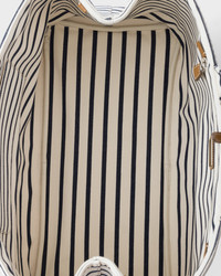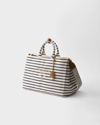 Timeless codes of nautical style inspired the design of this striped canvas bag, a reinterpretation of an iconic summer accessory. The removable shoulder strap increases the versatility of the light, roomy accessory completed with leather trim that reveals its refined, artisan essence. - Product code: 2VG131_2HJN_F0C56_V_OOO - Canvas handles - Detachable, adjustable woven tape shoulder strap. Maximum length 108 cm - Minimum length 68 cm - Maximum drop 48 cm - Minimum drop 26 cm - Embroidered logo on the front - Lettering logo embossed on the leather key ring - Side snap closure - Removable leather key ring - Interior with zipper and patch pockets - Canvas lining - Small metal purse feet - Imported Height: 30cm Width: 43cm Length: 20cm MATERIALS Main material: Cotton polyester