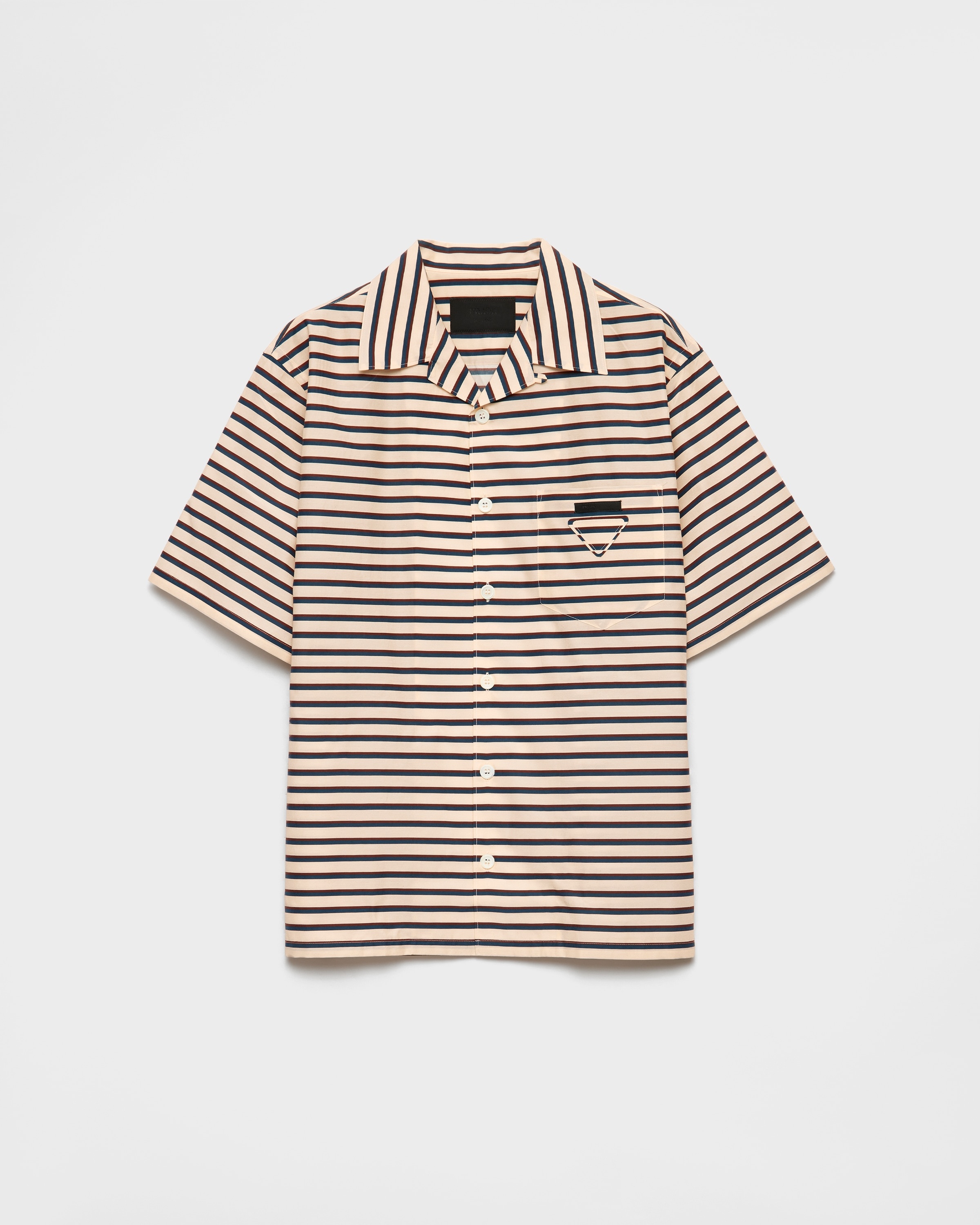 The shirt with bowling collar, a distinctive design of Prada collections, is reinterpreted for the new season with an alluring vintage-look striped print. The simple yet iconic shape of the triangle logo decorates the sporty garment. - Product code: UCS414_17N4_F0D91_S_UMO - "Stripes" print - Oversized fit - Bowling collar - Classic breast pocket - Straight hem - Mother-of-pearl button closure - Fabric triangle logo and sartorial logo label - Imported Height: 72cm MATERIALS Main material: 58% cotton 42% silk