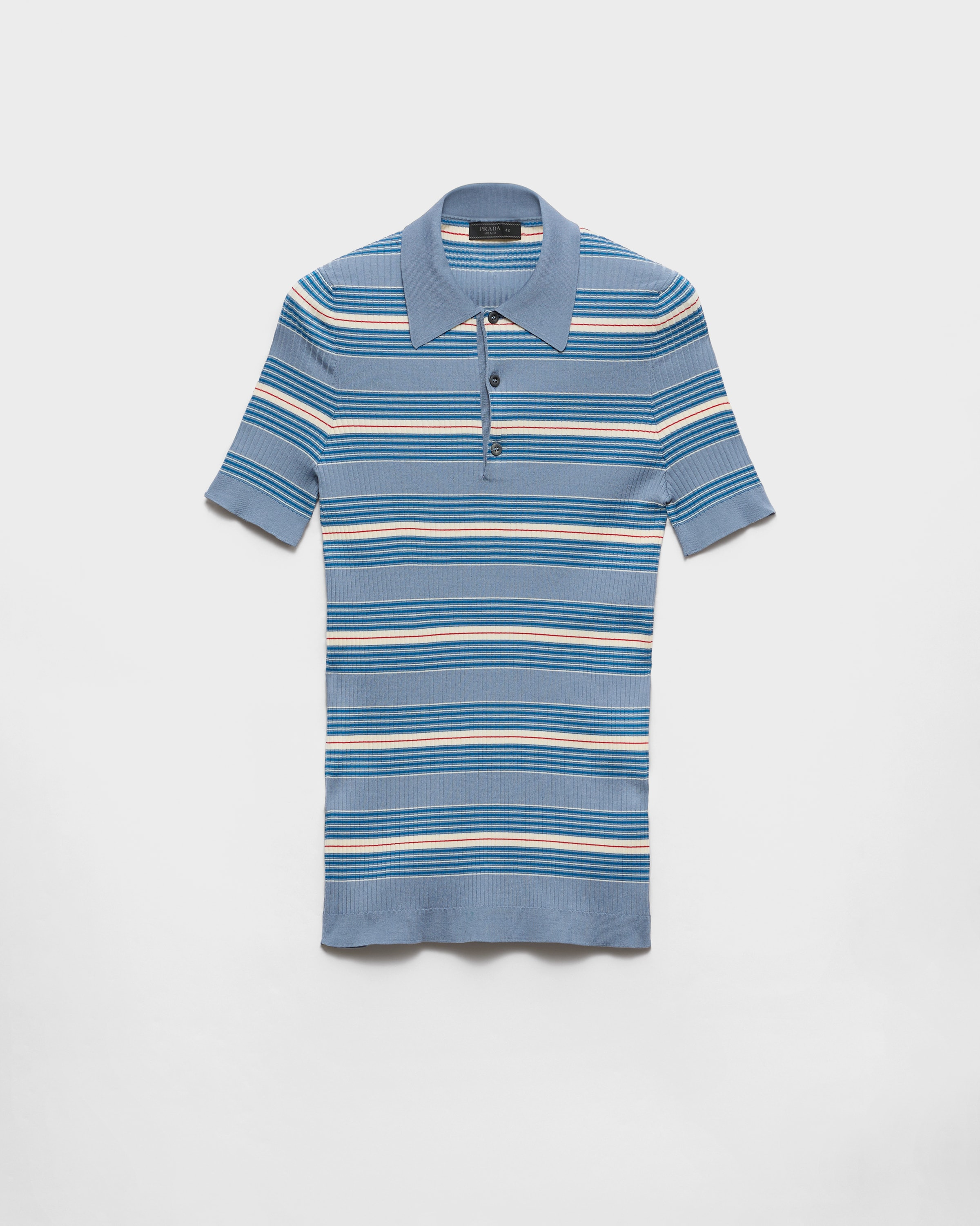 A sportswear classic, this polo shirt is reinterpreted with a slim fit and a lively stripe motif with vintage allure. The cotton knit garment has a light feel and is decorated with the tonal triangle logo. - Product code: UMF062_17KJ_F0237_S_OOO - Plain knit - Slim-fit silhouette - Polo collar - Ribbed knit hem - Fabric triangle logo--Sartorial label - Three-button front closure - Imported - The model is 187 cm tall and wears a size 48 Height: 68cm MATERIALS Main material: 100% cotton