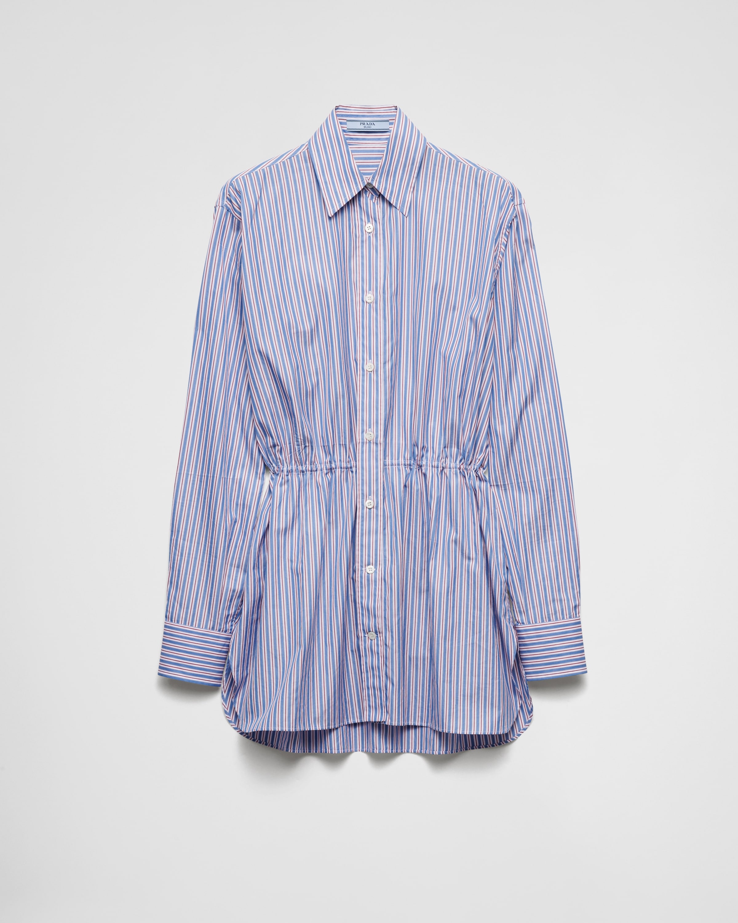 Blending architectural lines and fluidity, Prada redefines the classic tailored shirt with structured details and a renewed freedom of expression. - Product code: P488HG_16PF_F0013_S_OOO - Loose fit - Unlined garment - Shirt collar - Front button closure - Sleeves with shirt cuff - Fabric triangle logo - Straight hem - Internal drawstring detail at waist - Imported - The model is 179 cm tall and wears a size 38 Height: 85cm MATERIALS Main material: 100% cotton