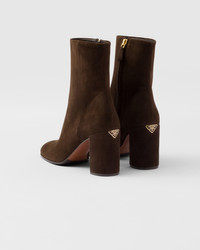 The sleek, refined design of these booties is emphasized by the soft touch of suede that adds a versatile and contemporary character to the footwear. - Product code: 1T631N_008_F0003_F_085 - Leather lining - Side zipper closure - Boot leg: 16 cm - Leather and rubber sole with hot-stamped logo - Suede-covered heel with enameled metal triangle logo, height 85 mm - Imported MATERIALS Main material: Lambskin