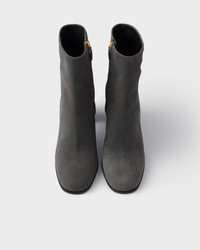 The sleek, refined design of these booties is emphasized by the soft touch of suede that adds a versatile and contemporary character to the footwear. - Product code: 1T631N_008_F0471_F_B085 - Leather lining - Side zipper closure - Boot leg: 16 cm - Leather and rubber sole with hot-stamped logo - Suede-covered heel with enameled metal triangle logo, height 85 mm - Imported MATERIALS Main material: Lambskin