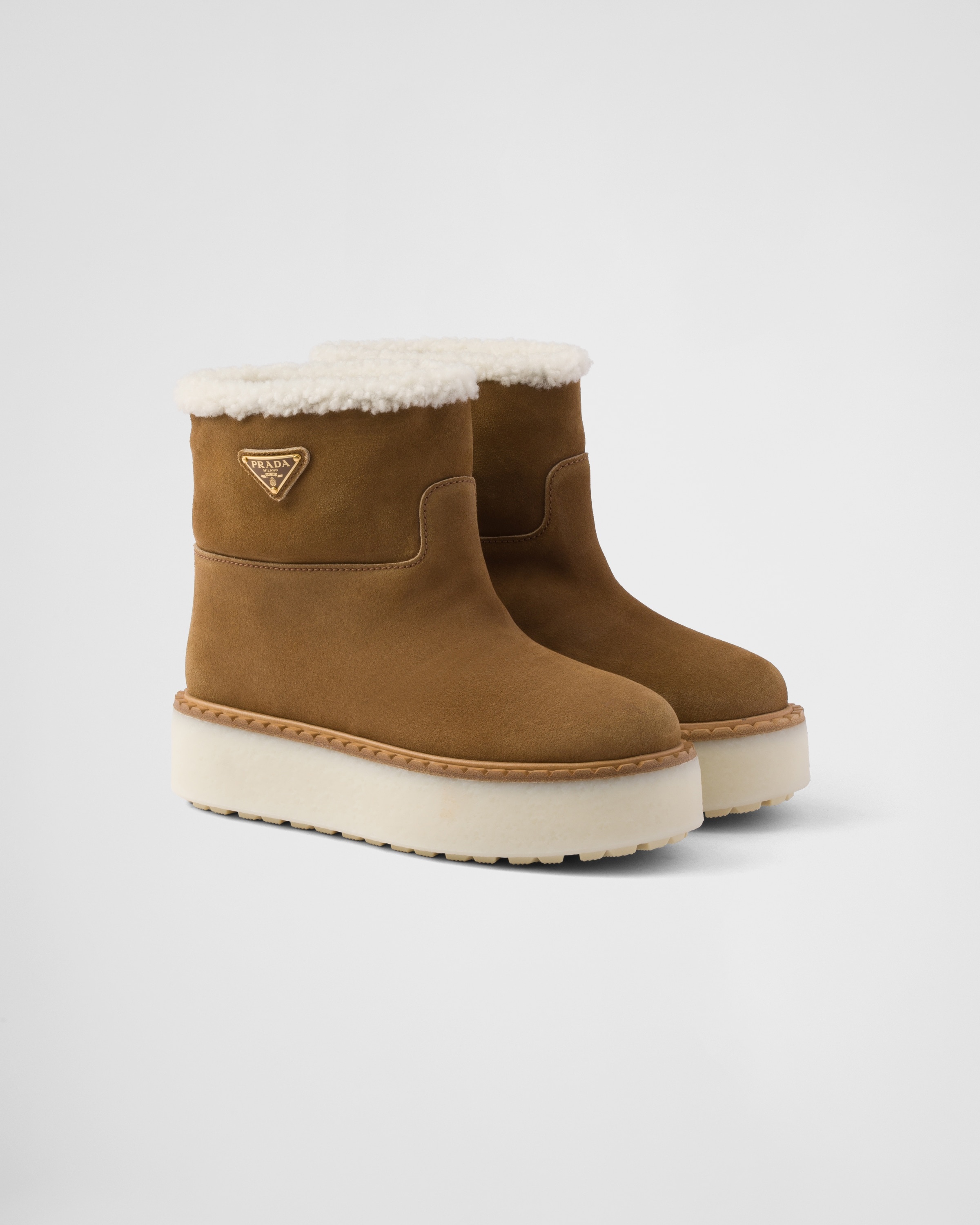 Clean lines and contemporary details define these suede booties, completed by rubber flatform soles and a soft shearling lining. - Product code: 1T729N_X0O_F0401_F_ZG50 - Shearling lining - Enameled metal triangle logo - Boot leg: 14 cm - Rubber flatform sole, 50 mm - Lug tread - Notched leather welt - Removable shearling-covered insole - Imported MATERIALS Main material: Calfskin