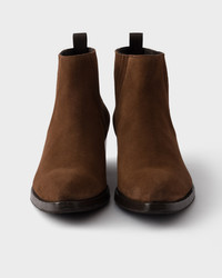 The soft texture of suede meets the sleek structure of Chelsea boots. Relaxed elegance and a contemporary spirit come together in a design of sophisticated lightness. - Product code: 2TA084_054_F0324_F_X000 - With elastic gusset - Screen-printed Prada logo - Leather sole with rubber half-sole and heel layer and gold-tone embossed logo - Heel height 55 mm - Leather insole - Imported MATERIALS Main material: Calfskin