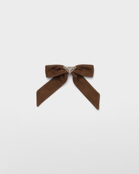 This suede hair clip featuring a bow with sophisticated allure is decorated with the enameled metal triangle logo. - Product code: 1IF154_008_F0324 - Clip closure - Enameled metal triangle logo - Imported Height: 3.6cm Width: 15cm MATERIALS Main material: Lambskin