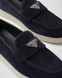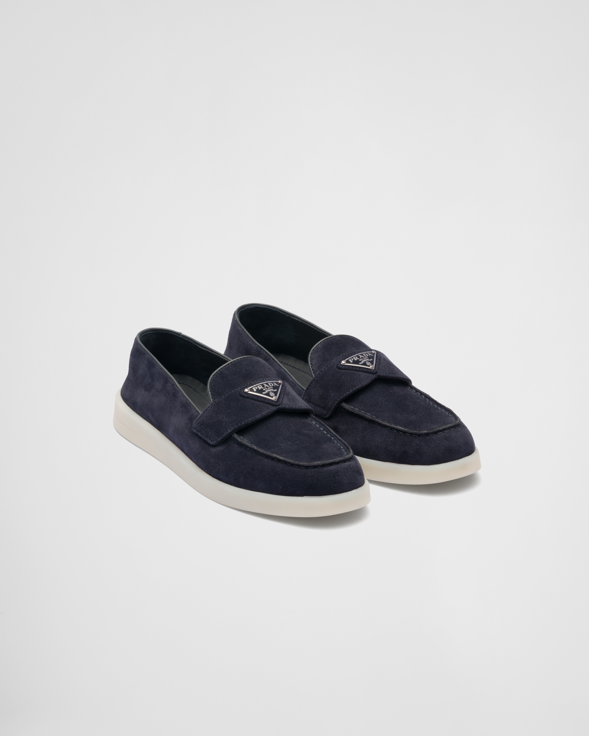These suede leather loafers express classic allure and are distinguished by the pinched stitch seam on the upper. The enameled metal triangle logo stands out on the front. - Product code: 1D222N_3LOL_F0008_F_025 - Upper with leather band - Apron with pinched stitch seam - Leather lining - Enameled metal triangle logo - 25 mm rubber sole - Removable leather-lined insole - Imported MATERIALS Main material: Calfskin