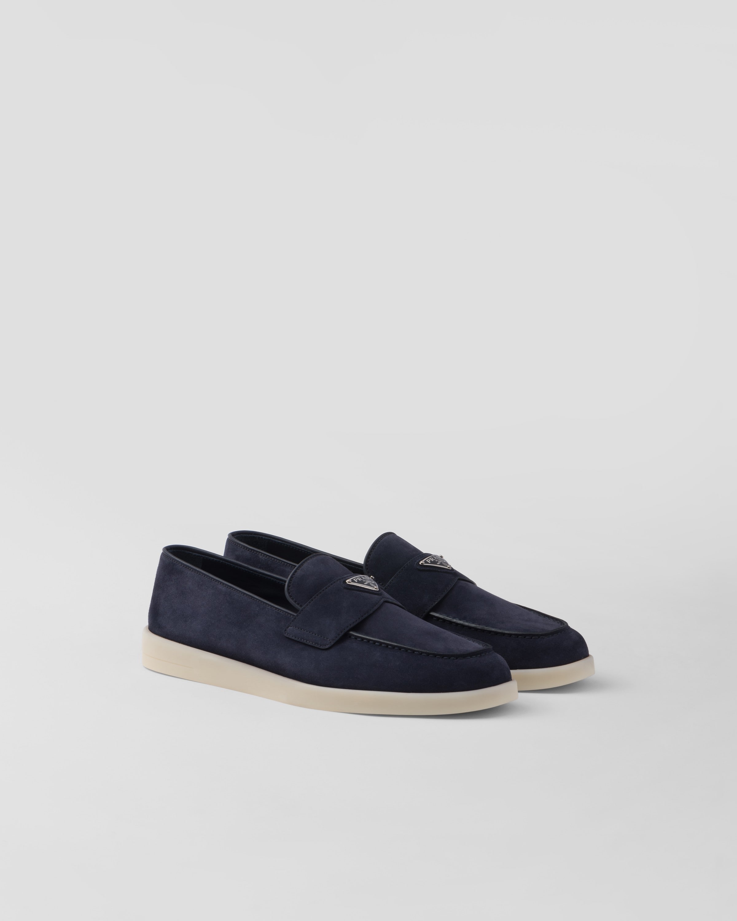 These soft suede loafers with a leather lining have a modern silhouette. The enameled metal triangle logo stands out on the front. - Product code: 2DG124_103_F0008_F_G001 - Band with enameled triangle logo - Apron with pinched stitch seam - Light rubber sole - Heel height: 15 mm - Removable leather-covered insole - Imported MATERIALS Main material: Calfskin