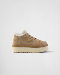 These mid-top suede sneakers with a contemporary design and sporty details are defined by the rubber flatform sole and soft shearling lining. - Product code: 1T725N_X0O_F0379_F_ZG50 - Shearling lining - Enameled metal triangle logo - Laces closure - Boot leg: 9 cm - Rubber flatform sole, 50 mm - Lug tread - Notched leather welt - Removable shearling-covered insole - Imported MATERIALS Main material: Calfskin