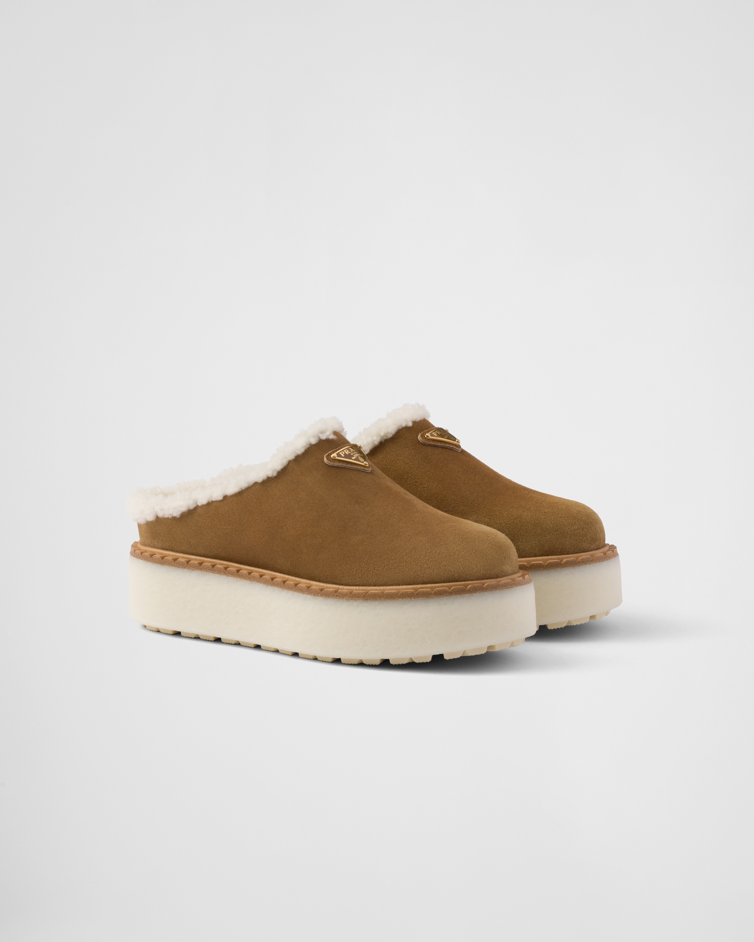 These suede slippers with a distinctive style and contemporary design are defined by rubber flatform soles and a soft shearling lining. - Product code: 1S715N_X0O_F0401_F_ZG50 - Shearling lining - Enameled metal triangle logo - Rubber sole, 50 mm - Lug tread - Removable shearling-covered insole - Imported MATERIALS Main material: Calfskin
