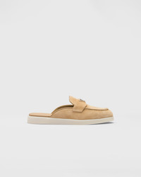 Modern silhouette for these mules made of soft suede with a leather lining. The enameled metal triangle logo embellishes the band, while the rubber sole adds a casual and versatile note to the design. - Product code: 1D270N_3LOL_F0379_F_025 - Upper with leather band - Leather lining - Enameled metal triangle logo - Rubber sole - Removable leather-lined insole - Imported MATERIALS Main material: Calfskin