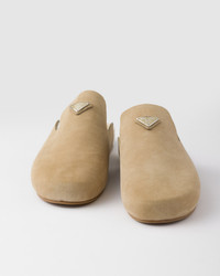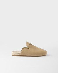 Sophisticated textures are combined in the design of these stylish casual mules decorated with the emblematic enameled metal triangle logo. - Product code: 2S2994_054_F0379_F_G000 - Leather lining - Upper with Prada Milano lettering logo - Lightweight rubber sole, 10 mm - Cord-covered insole with leather heel piece - Imported MATERIALS Main material: Calfskin