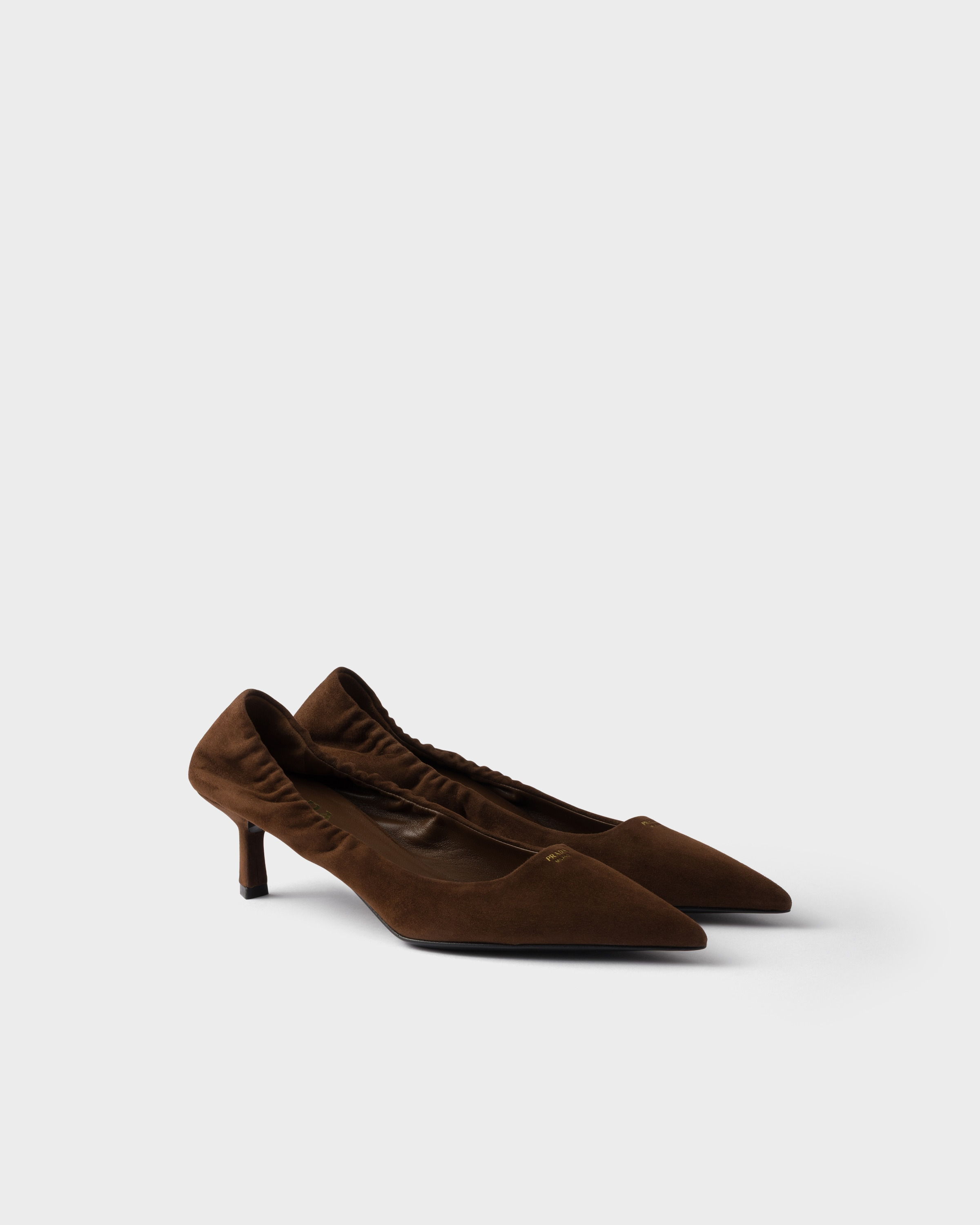 These suede pumps have a soft, tapered silhouette. The pointy toe style is characterized by a deconstructed design completed with elastic on the heel and an architectural heel inspired by the geometric shape of the iconic triangle. - Product code: 1I188O_008_F0324_F_D055 - Screen-printed logo - Leather sole with rubber heel layer and metal lettering logo - Leather-covered heel, 55 mm - Imported MATERIALS Main material: Lambskin