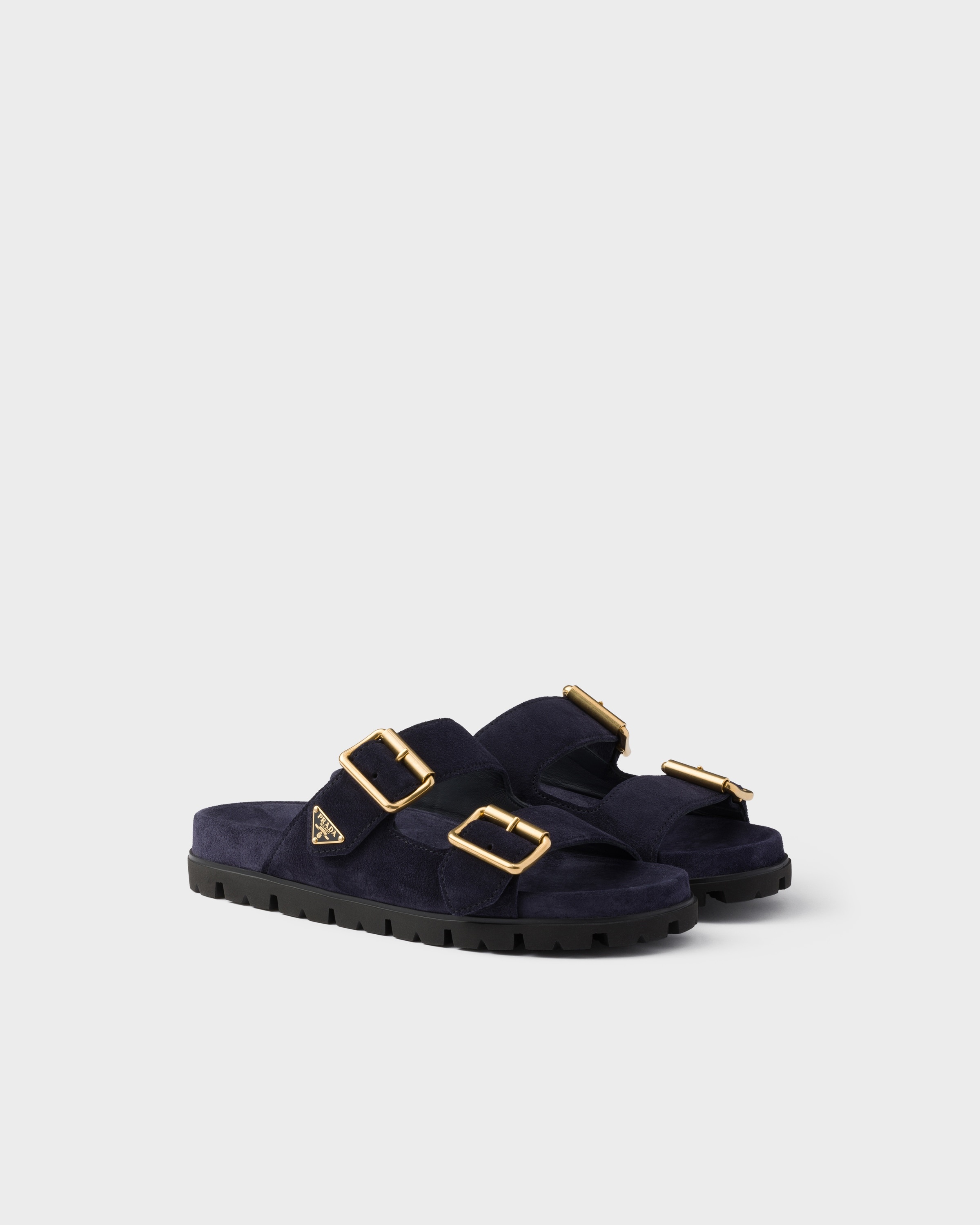 These suede slides with a casual style are defined by clean, contemporary lines. This versatile footwear characterized by straps with metal buckles are completed by rubber soles with a lug tread. The enameled metal triangle logo embellishes the style with its sleek and iconic signature touch. - Product code: 1XX692_054_F0008_F_020 - Upper with metal buckle - Enameled metal triangle logo - Rubber sole, height 20 mm - Lug tread - Imported MATERIALS Main material: Calfskin