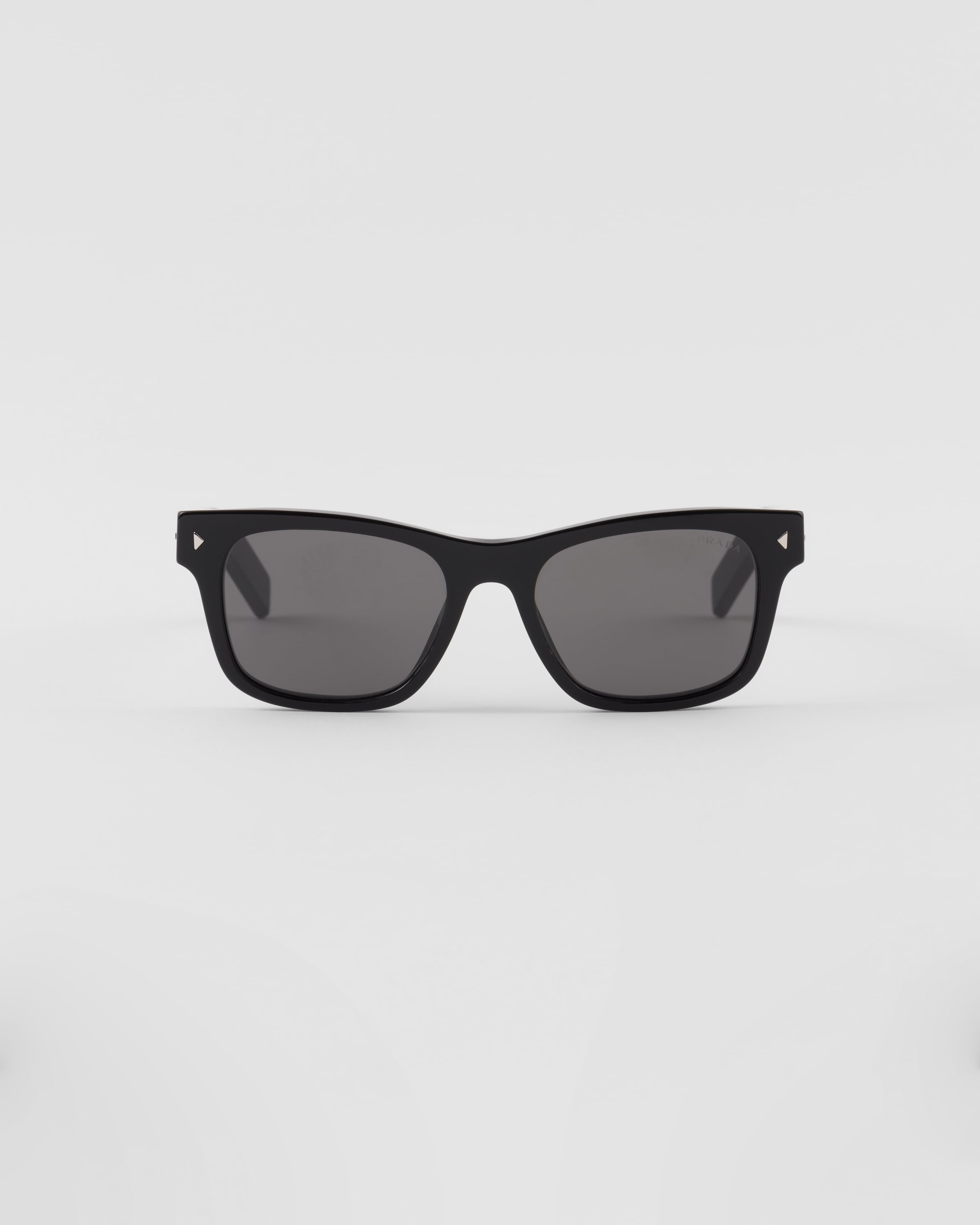 Acetate sunglasses with contemporary style. The squared front is characterized by refined triangular rivets, while the temples are highlighted by the iconic metal plaque with the Prada lettering logo. - Product code: SPRA17_E16K_FE731_C_054 - Recycled bio-acetate frame - Color: Black - Frame compatible with graduated lenses - 100% UVA / UVB protection - Crystal Lenses - Standard Fit - Lens-nose-temple measurement: 51-19-145 mm - Article comes with dedicated packaging - Other colors available - Imported MATERIALS Acetate