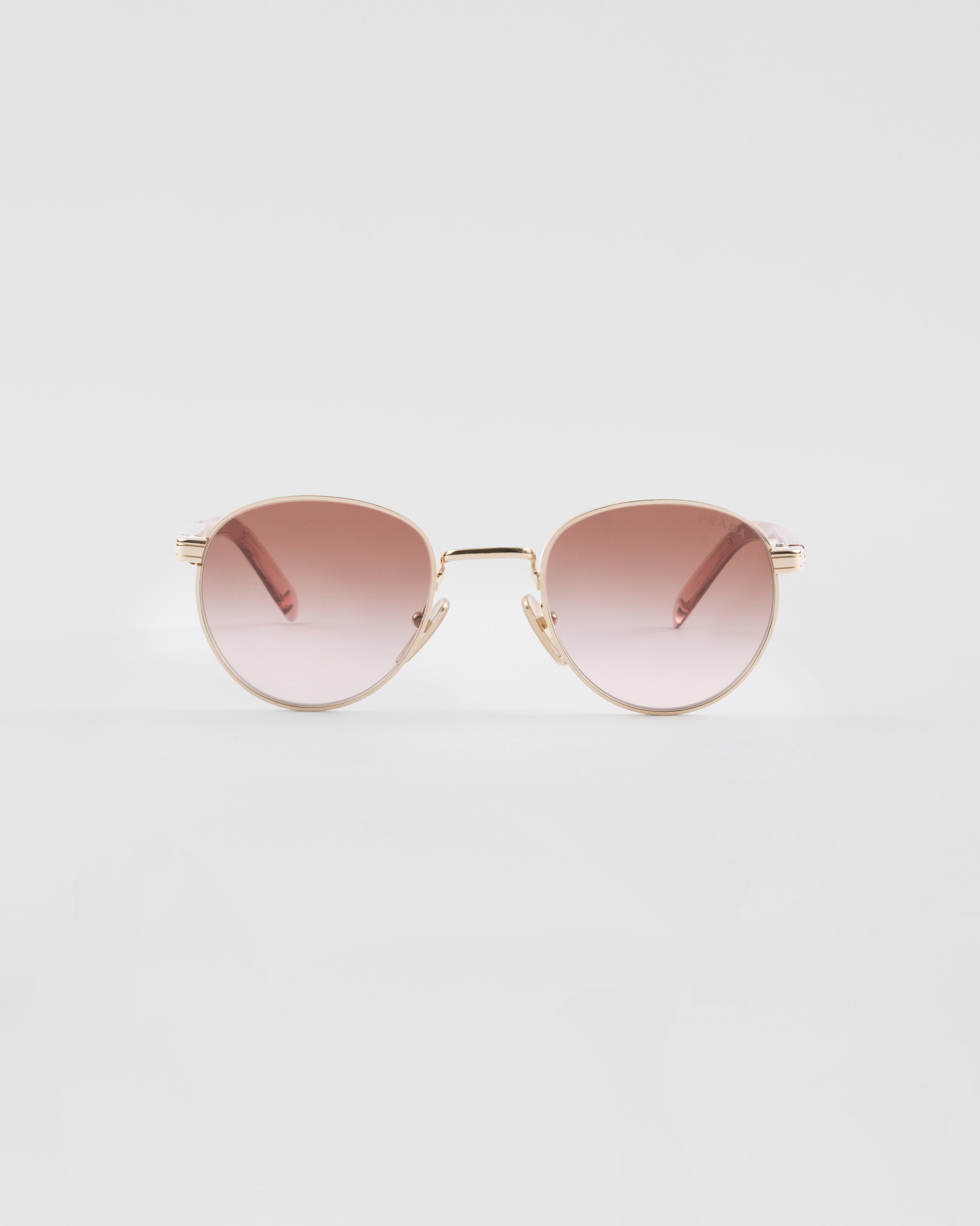 Metal sunglasses with a sleek, contemporary style. The rounded front is combined with thin temples highlighted by the sophisticated metal element with the finely engraved Prada lettering logo. - Product code: SPRB52_EZVN_F00A6_C_049 - Metal frame front - Color: Pale Gold - Frame compatible with graduated lenses - 100% UVA / UVB protection - Adjustable nose pads suitable for any fit - Lens-nose-temple measurements: 49-21-140 mm - Article comes with dedicated packaging - Other colors available - Imported MATERIALS Metal