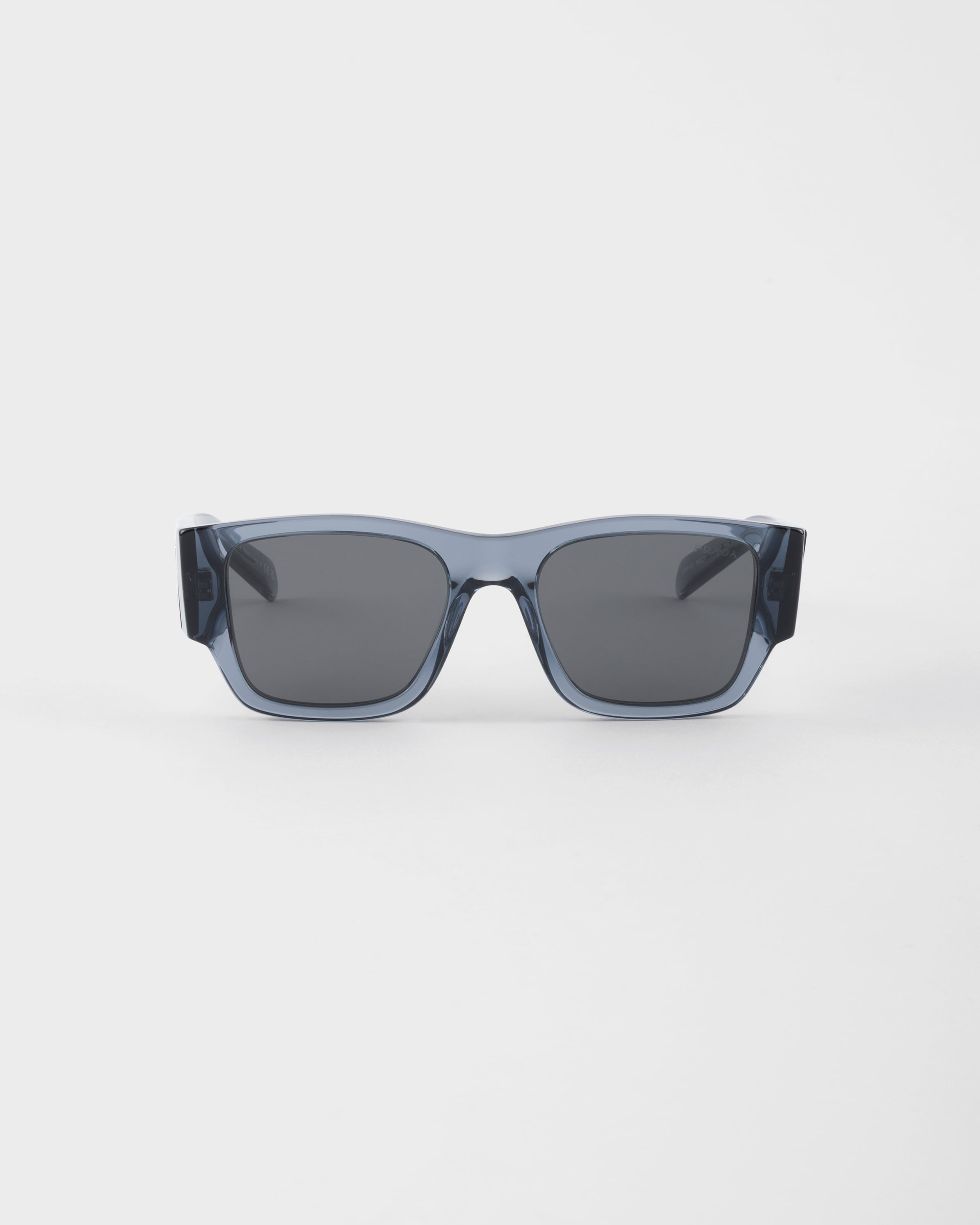Acetate sunglasses with a bold, geometric aesthetic. The frame has a strong, square design emphasized by chunky rims. The oversized temples are decorated with an exclusive metal plaque depicting the iconic Prada triangle logo. - Product code: SPR10Z_E17T_FE08Z_C_054 - Bio-acetate frame front - Color: Transparent Ocean Blue - Frame compatible with graduated lenses - 100% UVA / UVB protection - Standard Fit - Lens-nose-temple measurement: 54-20-140 mm - Article comes with dedicated packaging - Other colors available - Imported MATERIALS Acetate