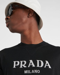 This crew-neck sweater interprets traditional knitwear in an innovative way, with references to the athleisure world. The sporty attitude is combined with the soft, cozy feel of the sleek garment made from superfine wool, a characteristic yarn used for Prada's iconic knitwear. Superfine wool, the most valuable in the world, stands out for its fineness, extreme lightness, and the exceptional length of its fibers, which allow it to maintain its original shape over time. - Product code: UMB272_1075_F0002_S_212 - Plain knit - Regular fit - Ribbed knit crew-neck - Regular shoulders - Ribbed knit cuffs and hem - Jacquard logo - Imported - The model is 187 cm tall and wears a size 48 Height: 66cm MATERIALS Main material: 100% virgin wool