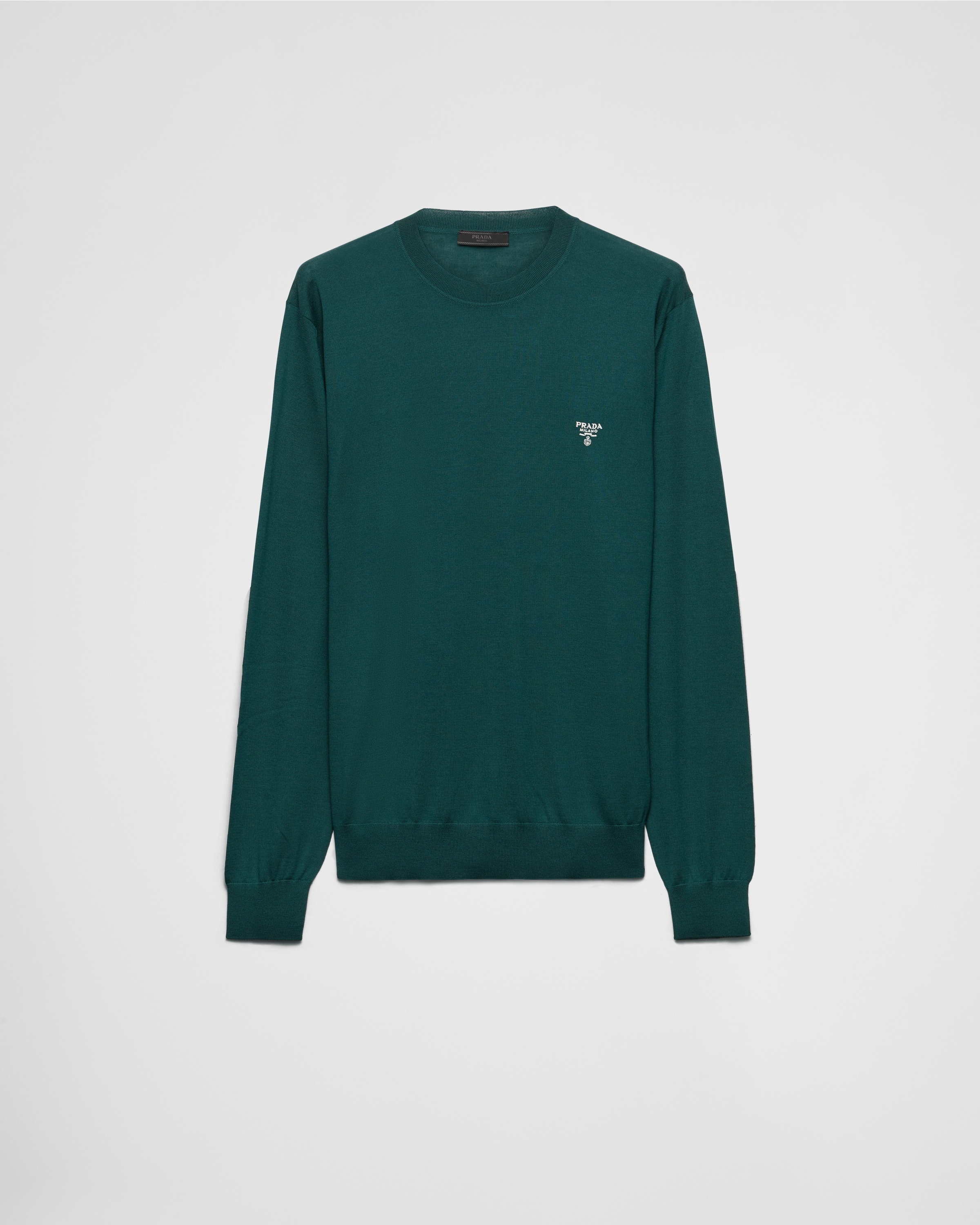 This crew-neck sweater, embellished with the embroidered logo, is made of superfine wool, a characteristic fabric of Prada's most iconic knitwear. Superfine wool, the most valuable in the world, stands out for its extreme lightness and the exceptional length of its fibers, which make it possible to maintain its original shape over time. - Product code: UMB264_1ZLE_F0UYB_S_212 - Plain stitch knit - Regular fit - Ribbed knit crew neck - Regular shoulder - Ribbed knit cuffs and hem - Embroidered logo - Imported - The model is 190 cm tall and wears a size 48 Height: 66cm MATERIALS Main material: 100% virgin wool