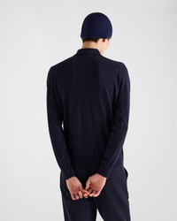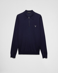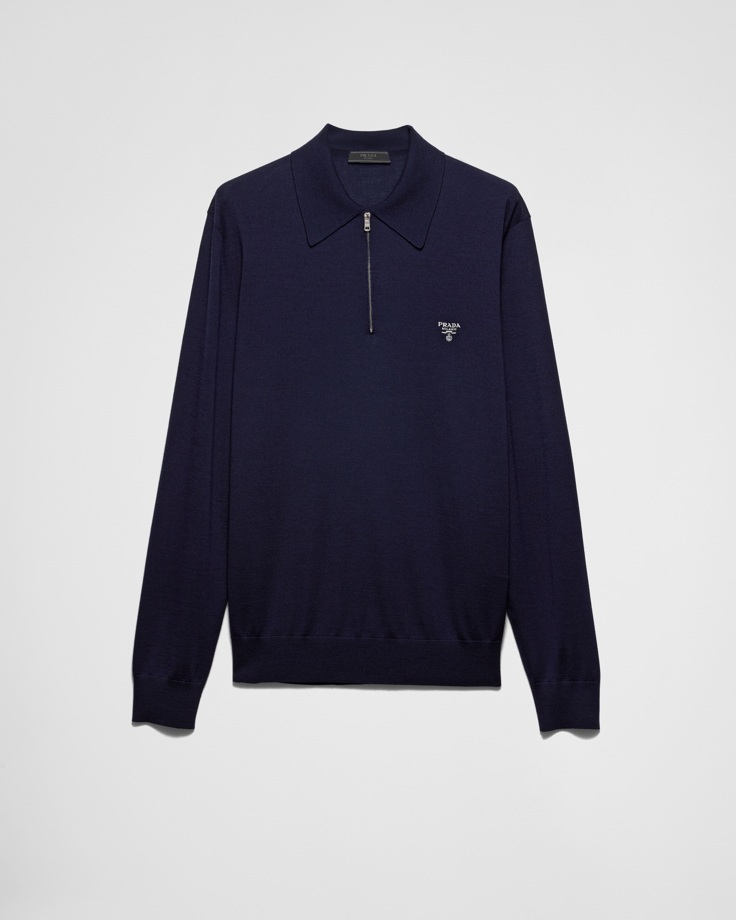 The minimalist silhouette of this polo shirt stands out thanks to the refined materials that characterize Prada knitwear. Sporty details complete the lightweight and soft garment made of superfine wool. - Product code: UMB815_1164_F0SVF_S_OOO - Plain knit - Regular fit - Polo collar - Semi-raglan shoulder - Ribbed knit cuffs and hem - Embroidered logo - Front zipper closure - Imported - The model is 189 cm tall and wears a size 48 Height: 66cm MATERIALS Main material: 100% virgin wool