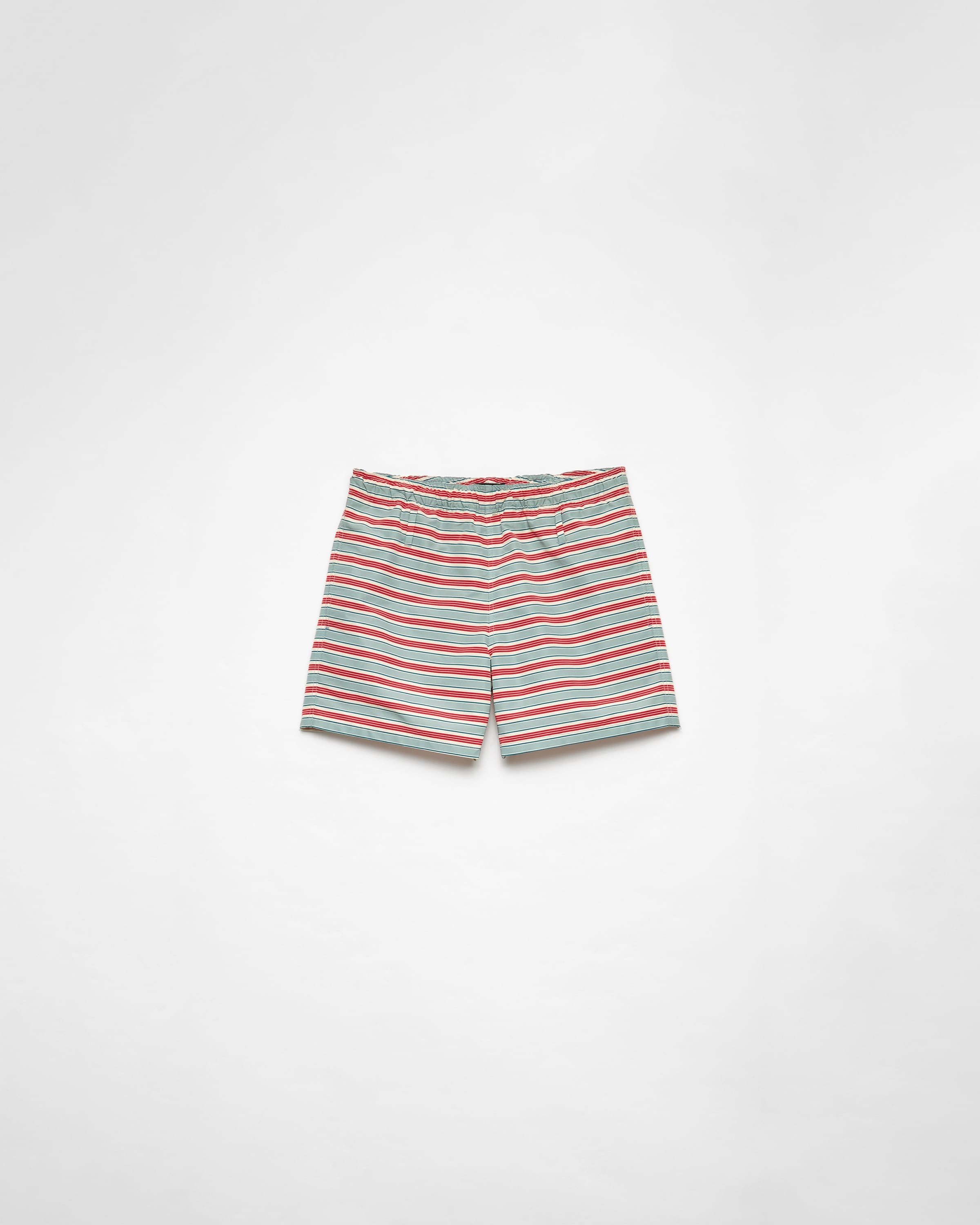 These technical fabric swim trunks are characterized by their sleek design completed with sporty yet refined details. A stripe motif with vintage charm enhances the style. For sustainable care to preserve the product's characteristics and reduce microfiber shedding, we recommend not washing the item too often. Let the product air out after every use and have it dry cleaned at a specialized ecological dry cleaners. - Product code: UB378_17N7_F0637_S_OOO - "Stripes" print - Straight fit - Elasticized waistband with drawstring - Mesh lining - Front welt pockets and back patch pockets - Re-Nylon pouch with triangle logo and sartorial logo label - Imported Height: 38cm MATERIALS Main material: 70% polyamide 30% recycled polyamide