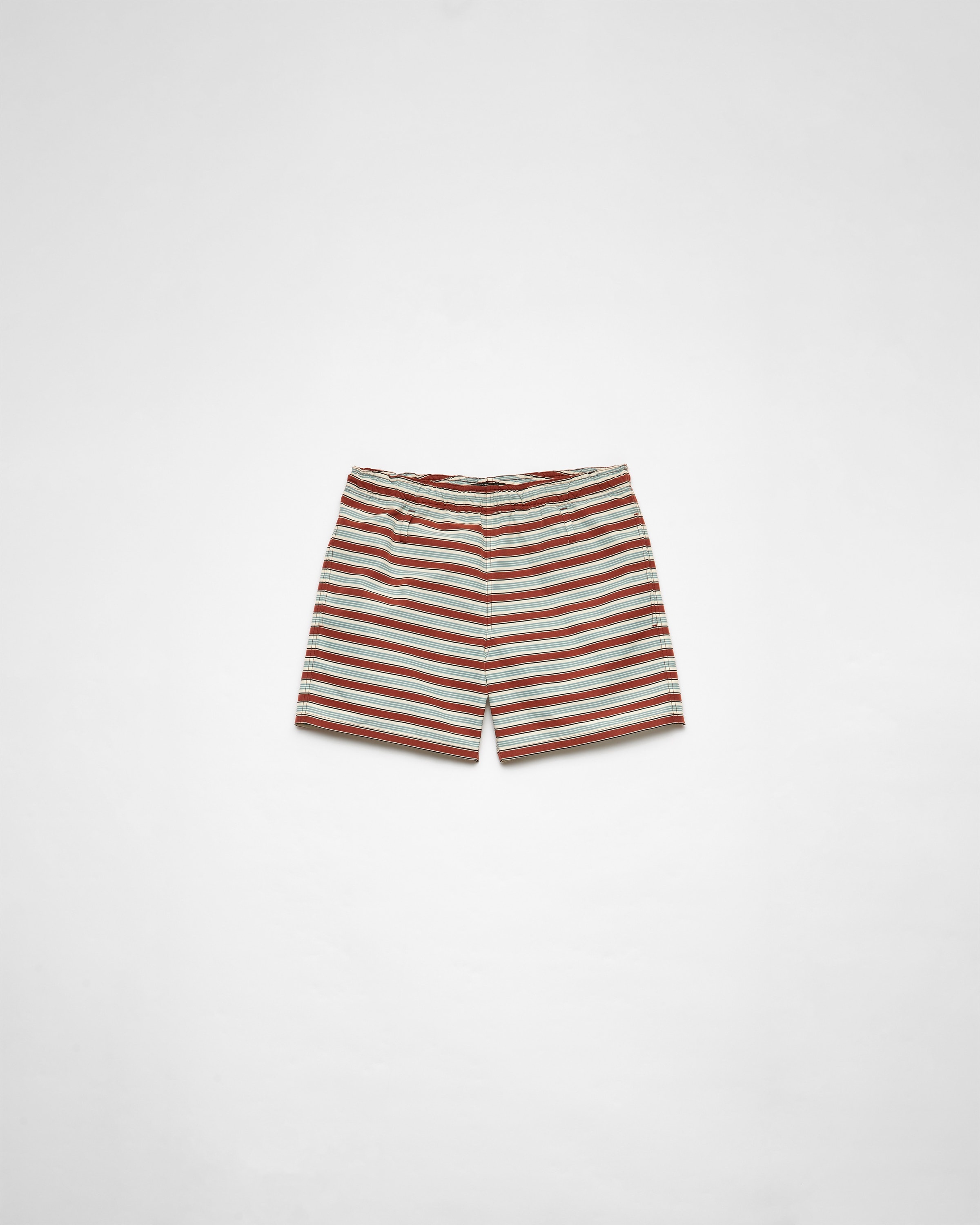 These technical fabric swim trunks are characterized by their sleek design completed with sporty yet refined details. A stripe motif with vintage charm enhances the style. For sustainable care to preserve the product's characteristics and reduce microfiber shedding, we recommend not washing the item too often. Let the product air out after every use and have it dry cleaned at a specialized ecological dry cleaners. - Product code: UB378_17N7_F0324_S_OOO - "Stripes" print - Straight fit - Elasticized waistband with drawstring - Mesh lining - Front welt pockets and back patch pockets - Re-Nylon pouch with triangle logo and sartorial logo label - Imported Height: 38cm MATERIALS Main material: 70% polyamide 30% recycled polyamide