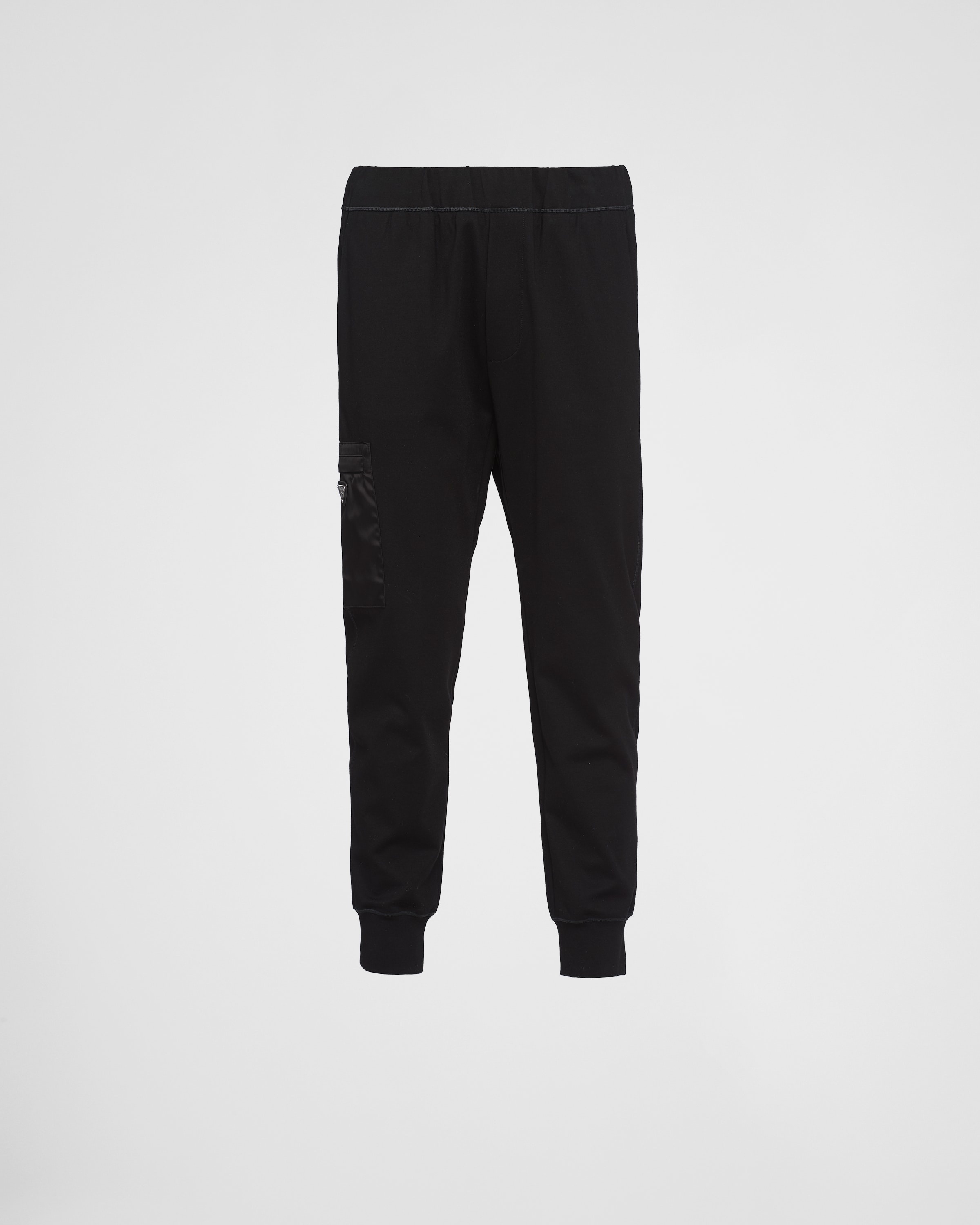 These sophisticated, elegant technical fleece pants are characterized by the tonal trim and a sporty nylon utility pocket inspired by cargo pants. The enameled metal triangle logo decorates the garment. - Product code: UJP175_1YSZ_F0806_S_212 - Skinny fit - Waistband with inner drawstring - Enameled metal triangle logo - Nylon zipper pocket on the leg - Length: 98 cm; Size: M - Zipper back pocket - Imported - The model is 185 cm tall and wears a size 48 Height: 98cm MATERIALS Main material: 5% elastane 30% polyamide 65% viscose