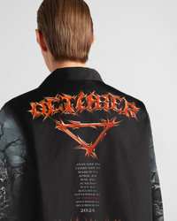 For the Timecapsule drop #58, Prada presents the first of a series of three limited edition shirts featuring a print inspired by the heavy metal aesthetic. From its dark palette to the edgy font, the October print reinterprets and personalizes the distinctive details seen on tees of the bands. Available exclusively online for just 24 hours, the drop includes the Timecapsule shirt and its NFT digital version that lets you become part of Prada's exclusive Crypted NFT community. - Product code: UCN608_165W_F0T38_S_OOO - "October" print - Oversized fit - Bowling collar - Classic breast pocket - Straight hem - Mother-of-pearl button closure - Triangle logo printed on the front - Imported - The model is 189 cm tall and wears a size 48 Height: 72cm MATERIALS Main material: 100% Cotton