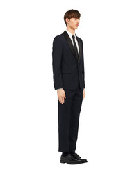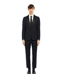 The elegance of this slim-fit single-breasted tuxedo in wool and mohair is enhanced by its silk satin lapels, buttons and waistband. - Product code: UAF421_BG4_F0AI7_S_141 - Slim fit - Lined jacket - Shawl lapels and silk button - Welt pockets with flap - Mid-rise trousers - Angled slash pockets on the front and welt pockets on the back - Silk waistband - 18 cm hem width - 84% wool, 16% mohair. - Imported Height: 72cm MATERIALS Wool