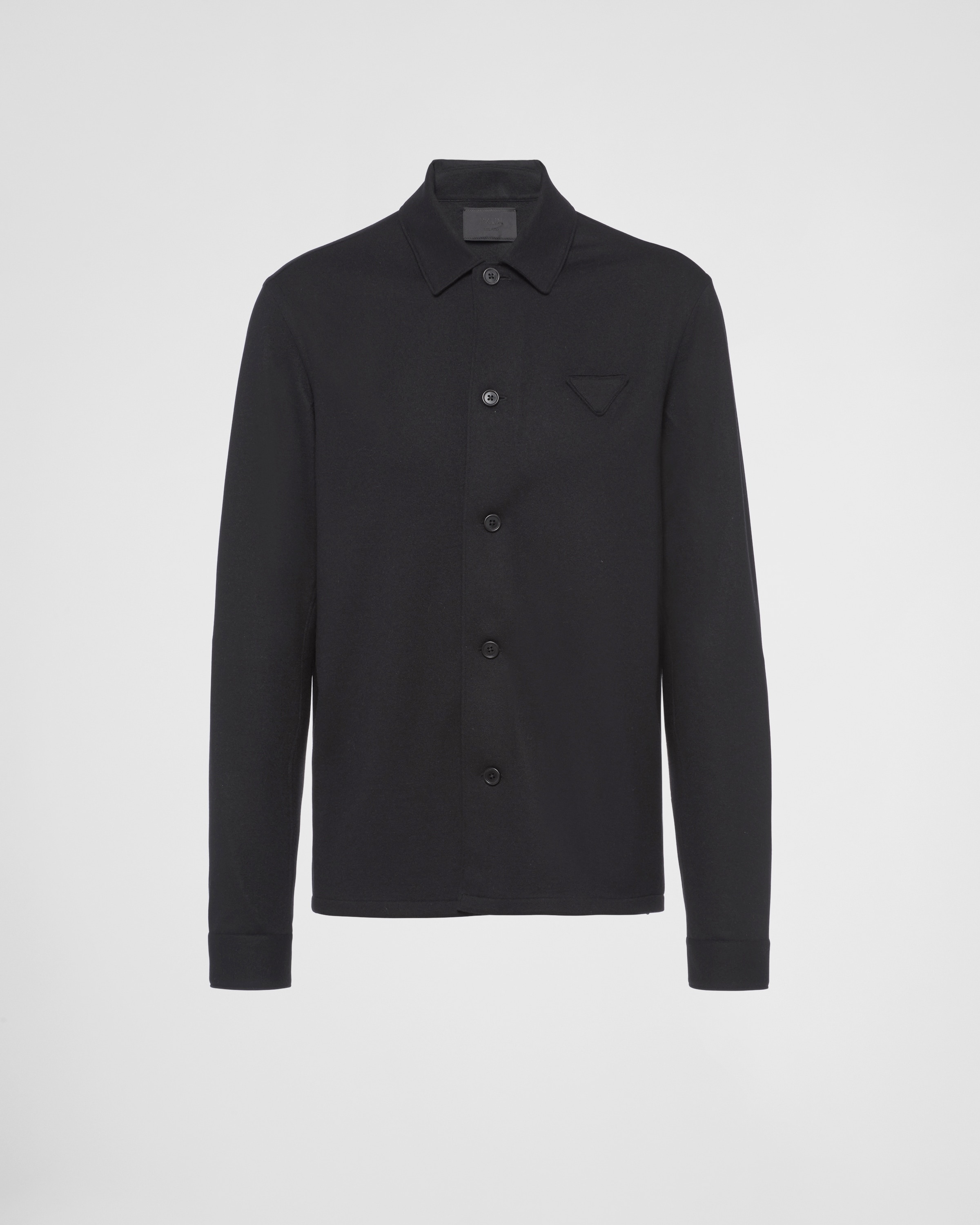 Sleek and refined, this shirt is characterized by its original horn button closure that underlines the hybrid soul of the garment that is decorated with the triangle logo reinterpreted as a fabric patch. - Product code: SC551_1Y5S_F0002_S_212 - Straight fit - Classic collar - Straight hem - Cuff with horn button - Horn button front closure - Fabric triangle logo - Top-stitching - Imported - The model is 186 cm tall and wears a size 48 Height: 68cm MATERIALS Main material: 50% cashmere 50% virgin wool