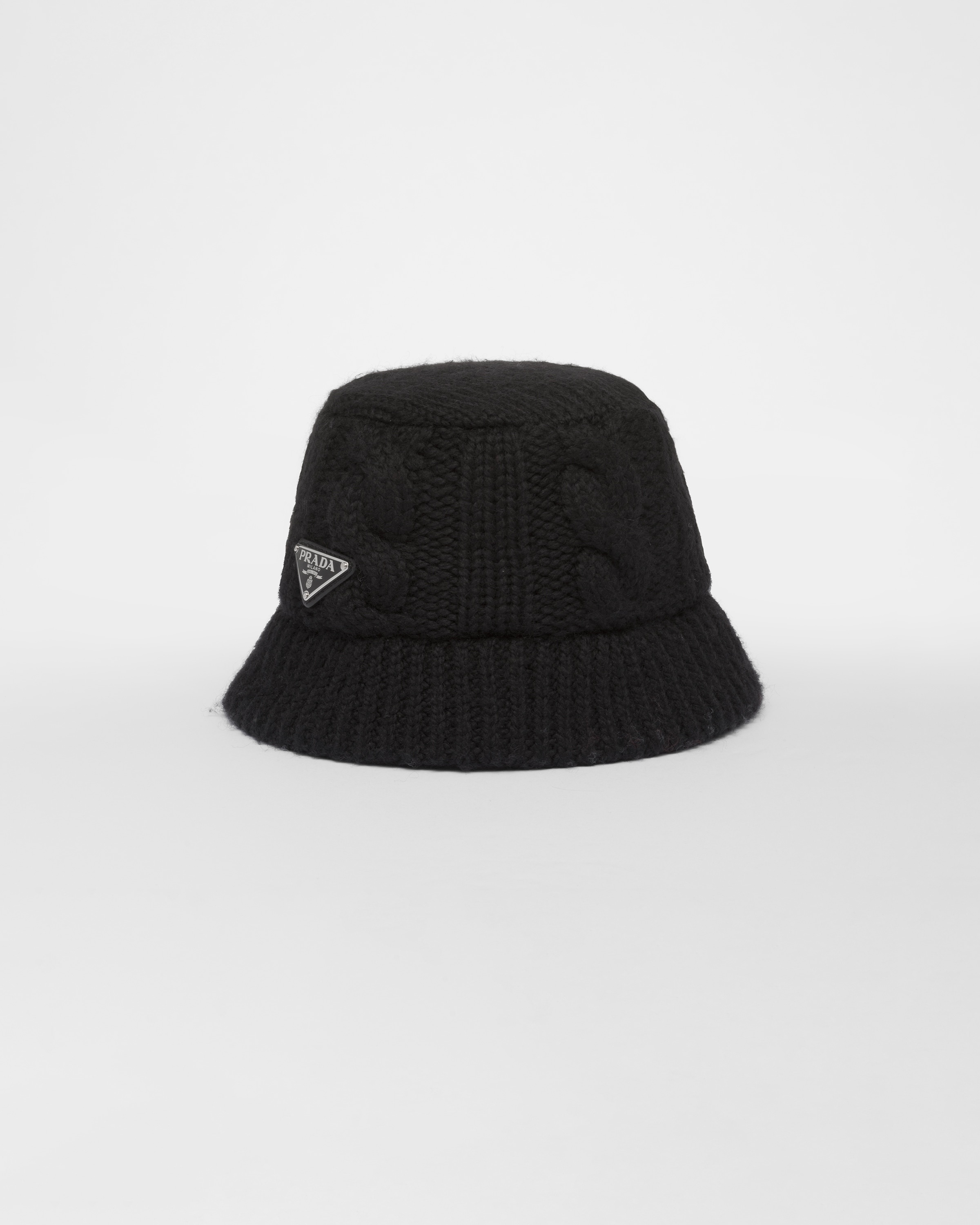 The iconic bucket hat is reinterpreted with a soft texture with wintry allure. Made with a cable-knit pattern, the accessory is decorated with the enameled metal triangle logo. - Product code: 1HC338_2CNW_F0002 - Cable knit - Enameled metal triangle logo - Cotton lining - Imported MATERIALS Fabric