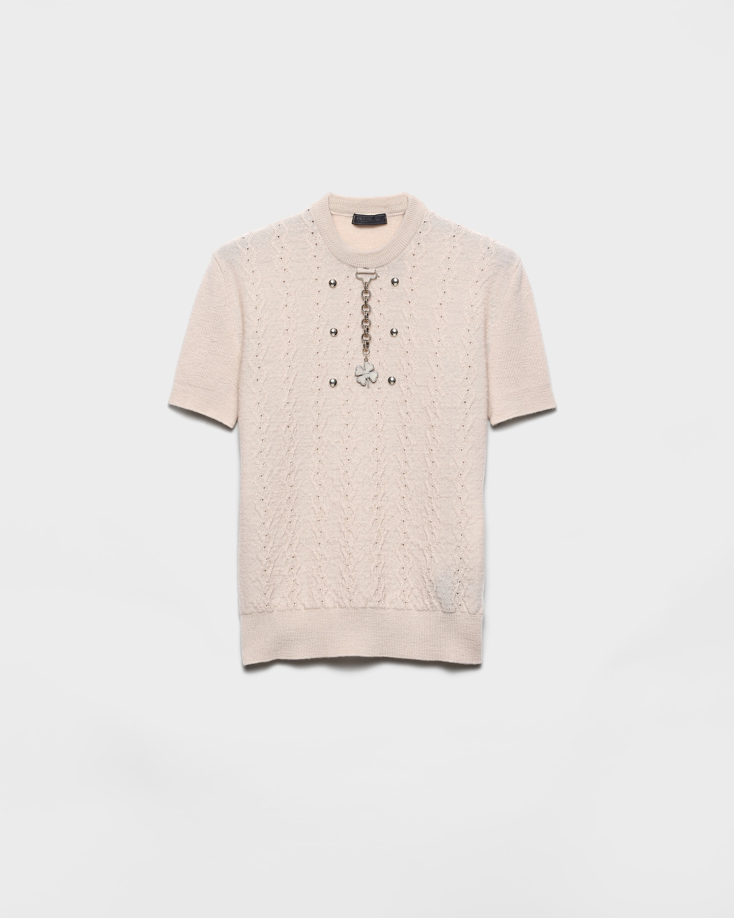 For the Fall/Winter collection 2025, knitwear is enriched with unique and refined decorations that recall good luck charms. This wool sweater with a slim silhouette is embellished with metal details in a new dialog between classic shapes and symbolic meanings. - Product code: UMF040_17KD_F0036_S_OOO - Plain knit - Slim fit - Ribbed knit crew-neck - Regular shoulder - Ribbed knit cuffs and hem - Imported - The model is 189 cm tall and wears a size 48 Height: 59cm MATERIALS Main material: 100% virgin wool