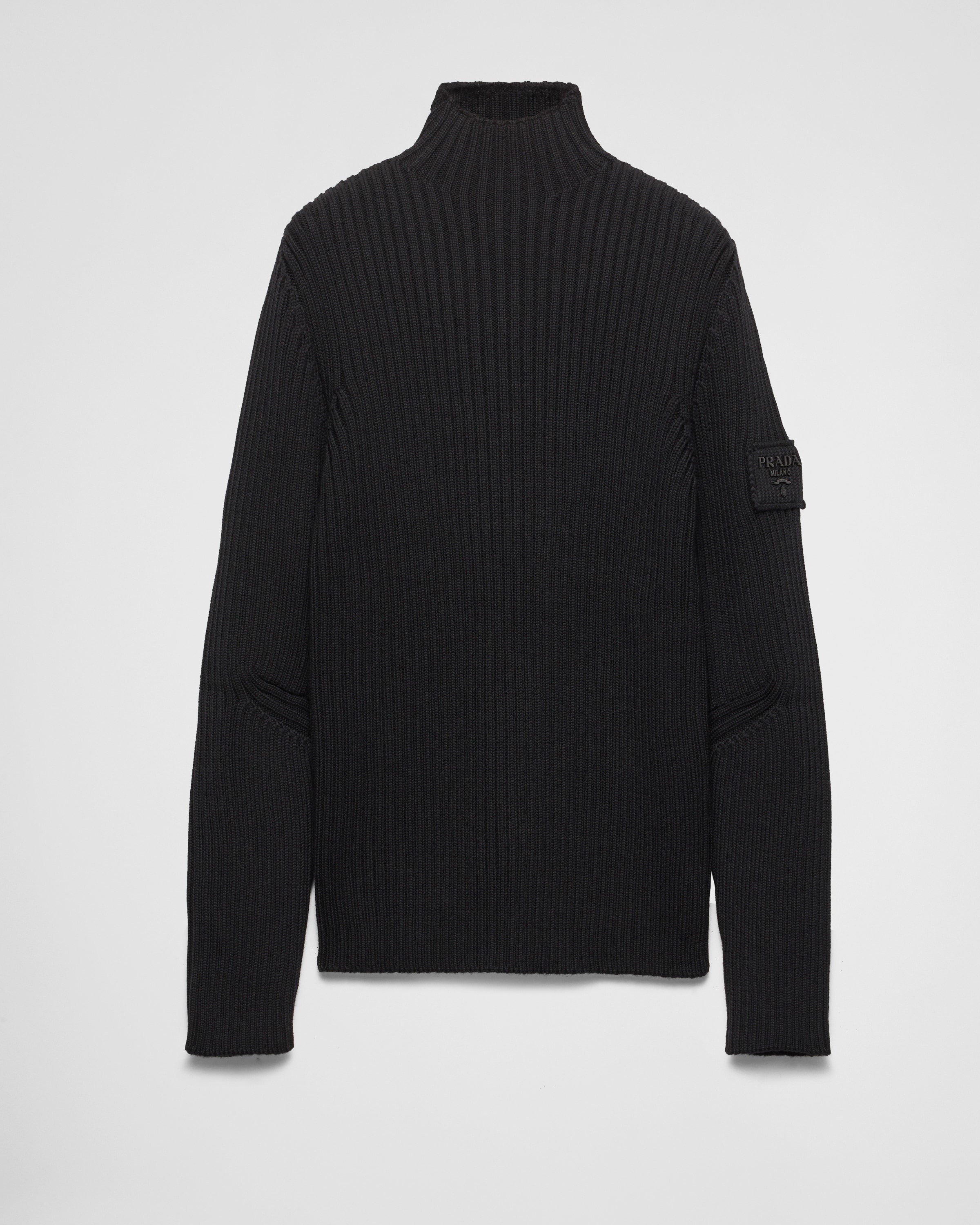 Refined details and workmanship define the design of this wool sweater with a slim fit and mock turtleneck. The ribbed knit silhouette, renewed in shape and attitude, is completed by the simple yet refined signature of the metal lettering logo in relief. - Product code: UMR620_15O6_F0002_S_OOO - Ribbed knit - Slim-fit silhouette - Ribbed knit mock turtleneck - Regular shoulder - Ribbed knit cuffs and hem - Knit logo patch - Imported - The model is 190 cm tall and wears a size 48 Height: 66cm MATERIALS Main material: 100% virgin wool