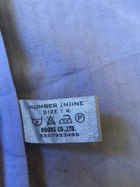 PLEASE ASK ANY QUESTION BEFORE BUYING!!! THIS IS USED CLOTHING!!! PLEASE DON’T EXPECTED IT TO BE LIKE NEW OR IN PRISTINE CONDITION!!! BRAND : Number (N)ine SIZE ON TAG : 4 MATERIAL : 60% Cotton 40% Polyester MEASUREMENT : 🚠 - Width (armpit to armpit) : 21.38 INCH - Length (shoulder to end of garment) : 28 INCH CONDITION : Has SMALL STAIN!!! Has ONE HOLE!!! MISSING BUTTON!!! An item that has been used or worn previously GREAT VINTAGE CONDITION (USED CLOTHING) **WE ARE USING MALAYSIA INTERNATIONAL REGISTER. PLEASE LEAVE YOUR PHONE NUMBER ON THE NOTE WHILE MAKE A PURCHASE** THANK YOU SO MUCH FOR WATCHING MY ITEM & HAPPY SHOPPING