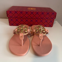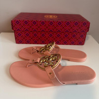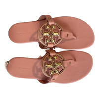 TORY BURCH Miller leather Metal Medallion Flat Thong Sandals Size 7 New In Box The Miller thong sandals from Tory Burch are made from pastel pink-colored nappa leather. This easy style has padded footbeds and large, laser-cut logo plaques for instant brand recognition. Sole: leather insole and sole Comes with a box Upper: leather Comes with dust bag Toe shape: round open toe Made in Vietnam Details Online since:2024-09-10 Categories: women Category: Shoes Sub-category: Sandals Designer: Tory Burch Condition: 0 Material: Leather Colour: Pink Size: 7 US Location: empty Reference: 47440864