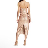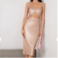 L'Agence dress encrusted in rose gold sequins V neckline Adjustable straps Cutout front Body-conscious silhouette Midi length Concealed back zipper Polyester Imported Size 6 Bust 17” Length 47” New with part of the hang tag $595