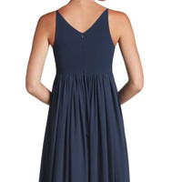 DRESS THE POPULATION BRIDAL PHOEBE CHIFFON GOWN True to size. XS=00, S=0-2, M=4-6, L=8-10, XL=12, XXL=14. Details & Care Take on wedding photos, ceremony and reception in undeniably flattering style in this flowing chiffon gown nipped at the waist and updated with a plunging neckline. Navy 65" length (size M) Hidden back-zip closure Plunging V-neck Sleeveless Floor-length A-line skirt Partially lined 100% polyester Dry clean Made in the USA Special Occasion Navy in color. Size Medium NWOT